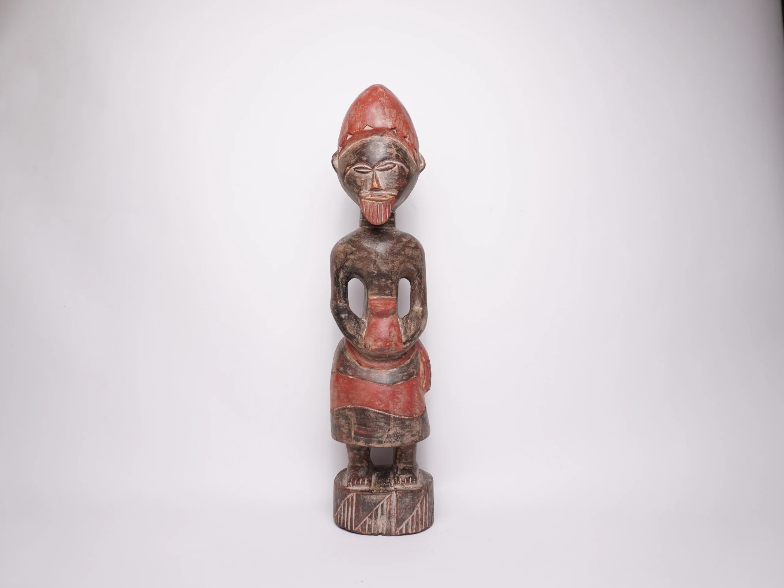 Carved Wooden Fetish Statue – Sacred Art with Spiritual Power A carved wooden fetish statue is a spiritually significant figure, often representing a human or animal form, believed to hold magical or divine power. Found in various cultural traditions—especially in parts of Africa and among Native American tribes—these statues are not merely artistic pieces but are treated as sacred objects of worship, protection, or healing. Key Features and Cultural Role: Spiritual Purpose: Fetish statues are believed to be vessels for spiritual forces or ancestral spirits. They are often used in rituals to invoke protection, attract blessings, offer healing, or ward off malevolent energies. Material and Craftsmanship: Although fetish figures can be made from bone, stone, or other natural materials, many are skillfully carved from wood. The craftsmanship may include added elements such as beads, cloth, feathers, nails, or mirrors—each holding symbolic meaning or enhancing the statue’s spiritual potency. Cultural Contexts: African Traditions: Among the Kongo and other Central African groups, fetish figures—known as nkisi or nkondi—are used in religious ceremonies. These statues may be activated with prayers, herbs, or other substances and often feature dramatic elements like iron nails or glass to symbolize power, action, and reflection. Zuni Fetishes (Native American): In Zuni tradition, fetishes are small carved animals that embody the spirit and attributes of the creature they represent. These sacred items are treated with great reverence, kept in special containers, and offered cornmeal or other gifts. They are sometimes blessed by spiritual leaders to reinforce their energy and protective function. Community Use vs. Commercial Art: While modern interpretations of fetish figures are sold as art or collectibles, authentic fetish carvings are typically kept within the community and used in spiritual practice—not intended for public display or commercial sale.