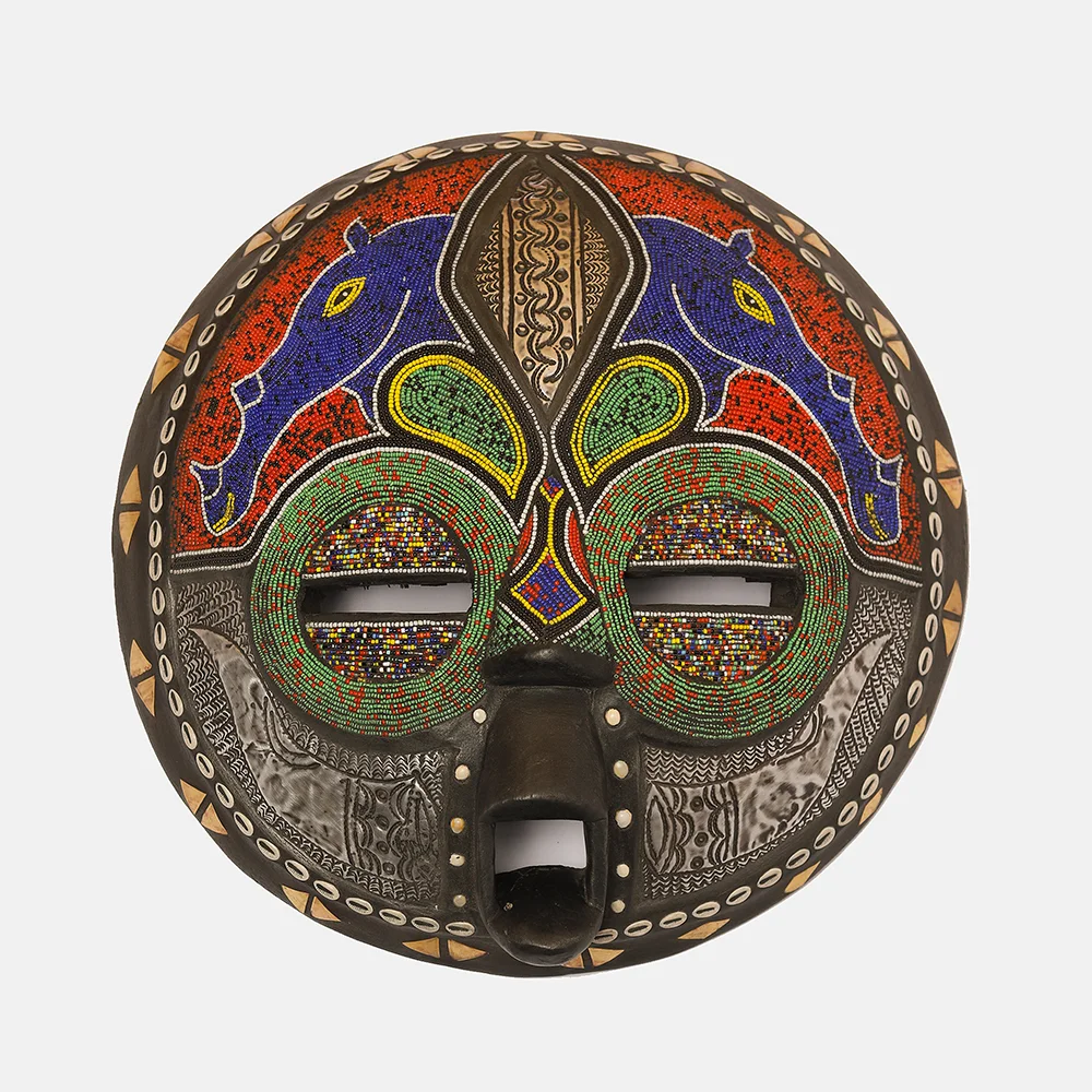 Ghanaian Round masks are typically made of wood and often feature a combination of geometric patterns, bold shapes, and symbolic elements. They are known for their association with well-being, harmony, and ancestral connections, often used in ceremonies and celebrations. The masks can vary in size and may incorporate intricate beadwork or other decorative elements like brass triangles. Here’s a more detailed look: Shape and Design: • Circular or round: The most defining characteristic is their rounded shape, which can vary in size and depth. • Geometric patterns: Many masks feature etched or carved geometric designs, sometimes arranged in a grid-like pattern. • Symbolic features: They often incorporate elements like slit eyes, protruding tongues, or abstracted facial features, each carrying specific symbolic meaning. Materials and Decoration: • Wood: The masks are primarily crafted from wood. • Beadwork: Some masks, particularly those from the Ashanti region, feature intricate beadwork in various colors. • Brass and other embellishments: Brass triangles, or other decorative elements, may also be incorporated. Cultural Significance: • Ceremonial use: Round masks are frequently used in ceremonies, festivals, and masquerade performances. • Spiritual connection: They are believed to facilitate communication with ancestors or spirits, bridging the gap between the physical and spiritual realms. • Symbolism of well-being: The masks often represent positive concepts like well-being, harmony, and prosperity. • Ashanti and Baule influence: Some masks, like those from the Ashanti region, showcase Baule sculpture styles and symbolism related to beauty and refinement