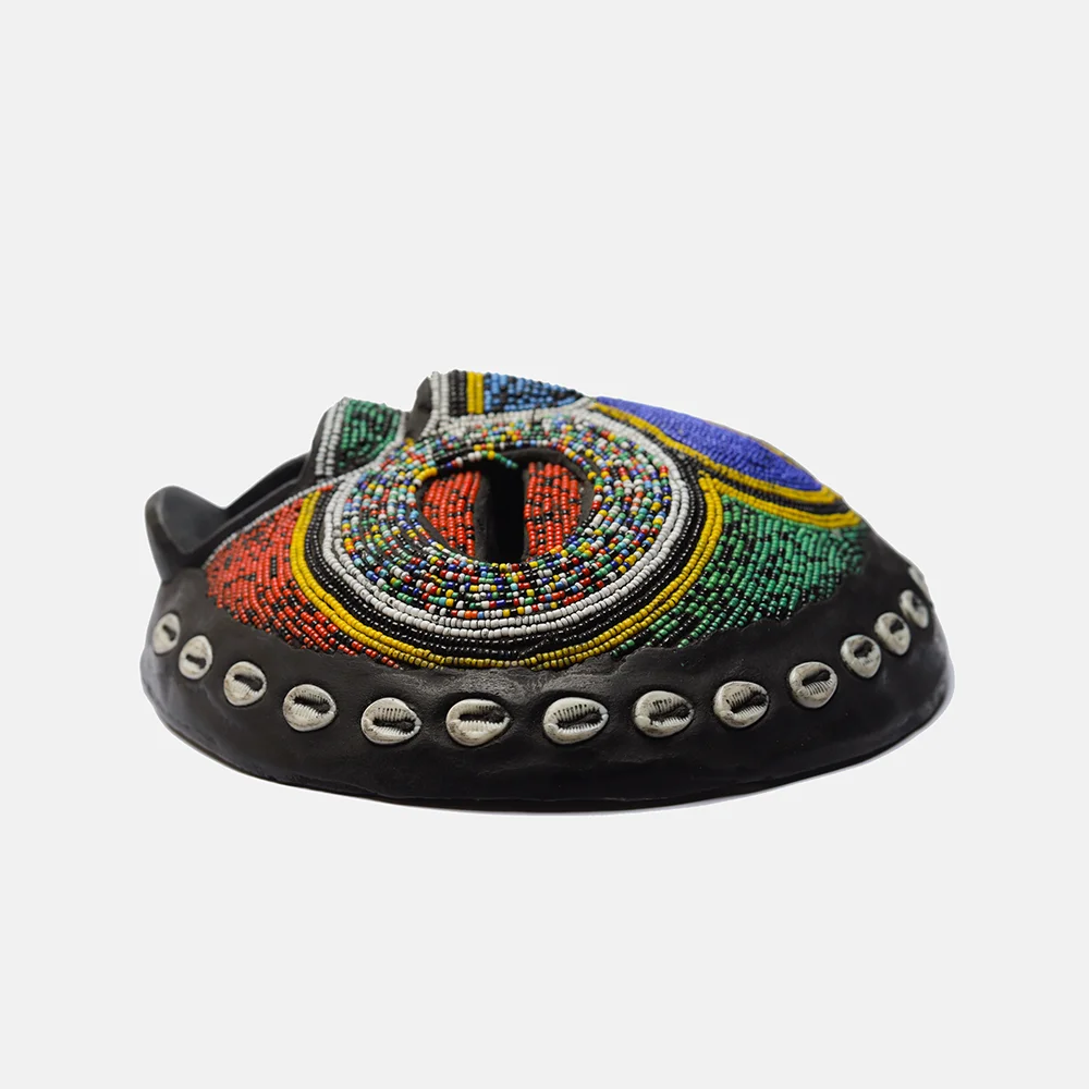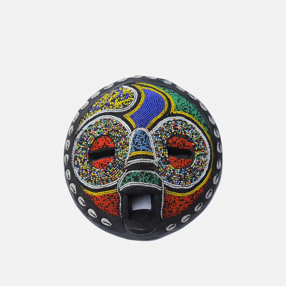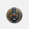 Ghanaian Round masks are typically made of wood and often feature a combination of geometric patterns, bold shapes, and symbolic elements. They are known for their association with well-being, harmony, and ancestral connections, often used in ceremonies and celebrations. The masks can vary in size and may incorporate intricate beadwork or other decorative elements like brass triangles. Here’s a more detailed look: Shape and Design: • Circular or round: The most defining characteristic is their rounded shape, which can vary in size and depth. • Geometric patterns: Many masks feature etched or carved geometric designs, sometimes arranged in a grid-like pattern. • Symbolic features: They often incorporate elements like slit eyes, protruding tongues, or abstracted facial features, each carrying specific symbolic meaning. Materials and Decoration: • Wood: The masks are primarily crafted from wood. • Beadwork: Some masks, particularly those from the Ashanti region, feature intricate beadwork in various colors. • Brass and other embellishments: Brass triangles, or other decorative elements, may also be incorporated. Cultural Significance: • Ceremonial use: Round masks are frequently used in ceremonies, festivals, and masquerade performances. • Spiritual connection: They are believed to facilitate communication with ancestors or spirits, bridging the gap between the physical and spiritual realms. • Symbolism of well-being: The masks often represent positive concepts like well-being, harmony, and prosperity. • Ashanti and Baule influence: Some masks, like those from the Ashanti region, showcase Baule sculpture styles and symbolism related to beauty and refinement