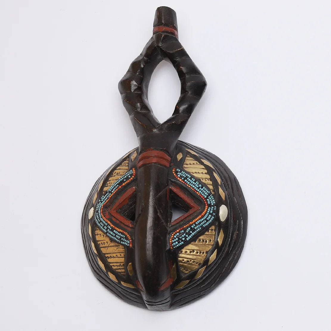 Bobo masks from Ghana, often made by the Bwa people (who are sometimes confused with the Bobo people), are primarily known for their use in rituals and ceremonies related to the spirit world and social order. These masks are crafted from wood, fiber, or leaves and feature distinctive designs and animal or geometric motifs. Key Characteristics of Bobo Masks: • Material: Bobo masks are crafted from materials like wood, fiber (often kenaf), and leaves. • Form: They can be face masks, helmet masks (covering the entire head), or plank masks (flat, extended forms). • Motifs: Masks often depict animals like monkeys, bush pigs, or birds, each carrying specific symbolic meanings. • Geometric Designs: Intricate geometric patterns are common, particularly on the front surface of the masks. • Coloration: Bright colors are often used, with black, white, and red being prominent. • Horns and Protrusions: Many masks feature prominent horns or other protruding elements. • Ritual Use: Bobo masks are central to initiation ceremonies, harvest rituals, funerals, and other important social and spiritual events. • Symbolic Meaning: They serve as a means of communication between the human and spirit realms, embodying deities and ancestral spirits. Distinguishing Features: • Animal Depictions: .Opens in new tab Specific animals like monkeys, bush pigs, and birds are common representations with specific symbolic meanings. • Geometric Designs: .Opens in new tab The intricate geometric patterns etched or painted on the masks are a hallmark of Bobo art. • Use of Fiber: .Opens in new tab The use of loose kenaf fibers as a mantle or covering for the mask is a characteristic feature, often associated with the Bobo Tere mask. Cultural Context: • Bwa People: .Opens in new tab The Bwa people, who are closely related to the Bobo, are known for their elaborate masks and masquerades. • Importance of Rituals: .Opens in new tab Bobo masks are integral to the Bwa’s worldview, connecting them to their ancestors, the spirit world, and the natural forces that govern their lives. • Initiation: .Opens in new tab Masks play a crucial role in the initiation of young men into adulthood, where they learn the meanings and responsibilities associated with the masks.