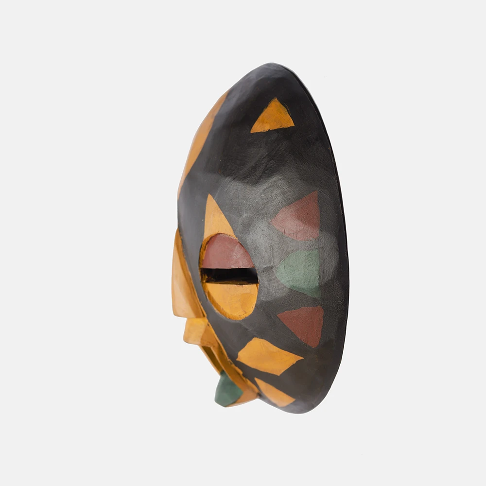 Ghanaian Round masks are typically made of wood and often feature a combination of geometric patterns, bold shapes, and symbolic elements. They are known for their association with well-being, harmony, and ancestral connections, often used in ceremonies and celebrations. The masks can vary in size and may incorporate intricate beadwork or other decorative elements like brass triangles. Here’s a more detailed look: Shape and Design: • Circular or round: The most defining characteristic is their rounded shape, which can vary in size and depth. • Geometric patterns: Many masks feature etched or carved geometric designs, sometimes arranged in a grid-like pattern. • Symbolic features: They often incorporate elements like slit eyes, protruding tongues, or abstracted facial features, each carrying specific symbolic meaning. Materials and Decoration: • Wood: The masks are primarily crafted from wood. • Beadwork: Some masks, particularly those from the Ashanti region, feature intricate beadwork in various colors. • Brass and other embellishments: Brass triangles, or other decorative elements, may also be incorporated. Cultural Significance: • Ceremonial use: Round masks are frequently used in ceremonies, festivals, and masquerade performances. • Spiritual connection: They are believed to facilitate communication with ancestors or spirits, bridging the gap between the physical and spiritual realms. • Symbolism of well-being: The masks often represent positive concepts like well-being, harmony, and prosperity. • Ashanti and Baule influence: Some masks, like those from the Ashanti region, showcase Baule sculpture styles and symbolism related to beauty and refinement