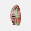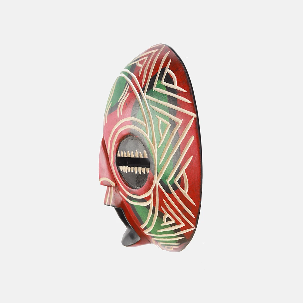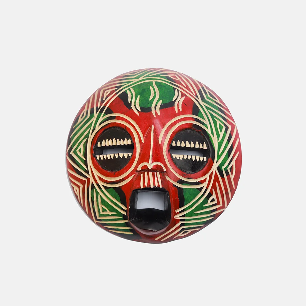 Ghanaian Round masks are typically made of wood and often feature a combination of geometric patterns, bold shapes, and symbolic elements. They are known for their association with well-being, harmony, and ancestral connections, often used in ceremonies and celebrations. The masks can vary in size and may incorporate intricate beadwork or other decorative elements like brass triangles. Here’s a more detailed look: Shape and Design: • Circular or round: The most defining characteristic is their rounded shape, which can vary in size and depth. • Geometric patterns: Many masks feature etched or carved geometric designs, sometimes arranged in a grid-like pattern. • Symbolic features: They often incorporate elements like slit eyes, protruding tongues, or abstracted facial features, each carrying specific symbolic meaning. Materials and Decoration: • Wood: The masks are primarily crafted from wood. • Beadwork: Some masks, particularly those from the Ashanti region, feature intricate beadwork in various colors. • Brass and other embellishments: Brass triangles, or other decorative elements, may also be incorporated. Cultural Significance: • Ceremonial use: Round masks are frequently used in ceremonies, festivals, and masquerade performances. • Spiritual connection: They are believed to facilitate communication with ancestors or spirits, bridging the gap between the physical and spiritual realms. • Symbolism of well-being: The masks often represent positive concepts like well-being, harmony, and prosperity. • Ashanti and Baule influence: Some masks, like those from the Ashanti region, showcase Baule sculpture styles and symbolism related to beauty and refinement