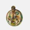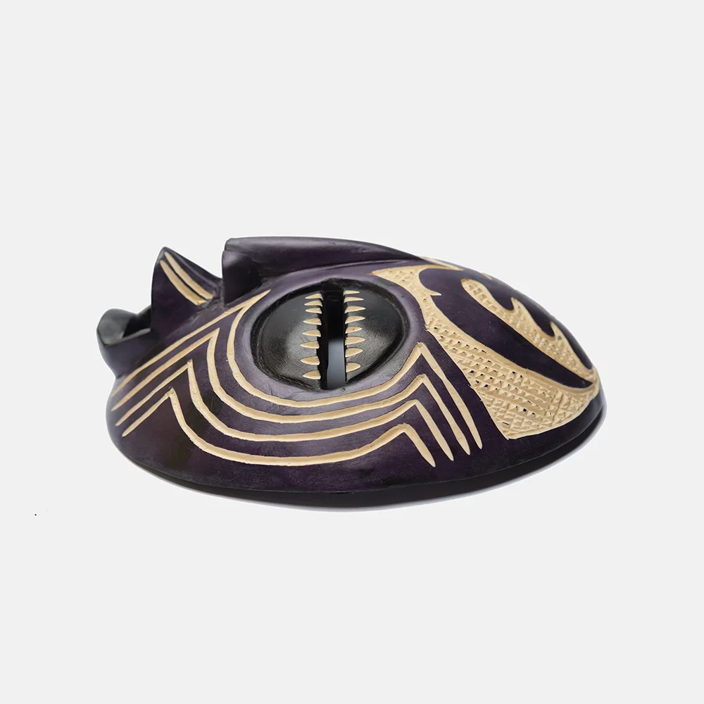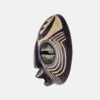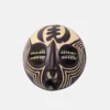 Ghanaian Round masks are typically made of wood and often feature a combination of geometric patterns, bold shapes, and symbolic elements. They are known for their association with well-being, harmony, and ancestral connections, often used in ceremonies and celebrations. The masks can vary in size and may incorporate intricate beadwork or other decorative elements like brass triangles. Here’s a more detailed look: Shape and Design: • Circular or round: The most defining characteristic is their rounded shape, which can vary in size and depth. • Geometric patterns: Many masks feature etched or carved geometric designs, sometimes arranged in a grid-like pattern. • Symbolic features: They often incorporate elements like slit eyes, protruding tongues, or abstracted facial features, each carrying specific symbolic meaning. Materials and Decoration: • Wood: The masks are primarily crafted from wood. • Beadwork: Some masks, particularly those from the Ashanti region, feature intricate beadwork in various colors. • Brass and other embellishments: Brass triangles, or other decorative elements, may also be incorporated. Cultural Significance: • Ceremonial use: Round masks are frequently used in ceremonies, festivals, and masquerade performances. • Spiritual connection: They are believed to facilitate communication with ancestors or spirits, bridging the gap between the physical and spiritual realms. • Symbolism of well-being: The masks often represent positive concepts like well-being, harmony, and prosperity. • Ashanti and Baule influence: Some masks, like those from the Ashanti region, showcase Baule sculpture styles and symbolism related to beauty and refinement
