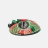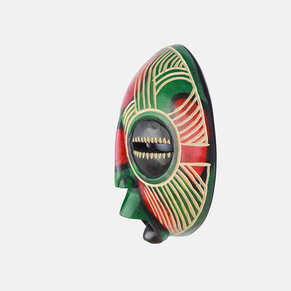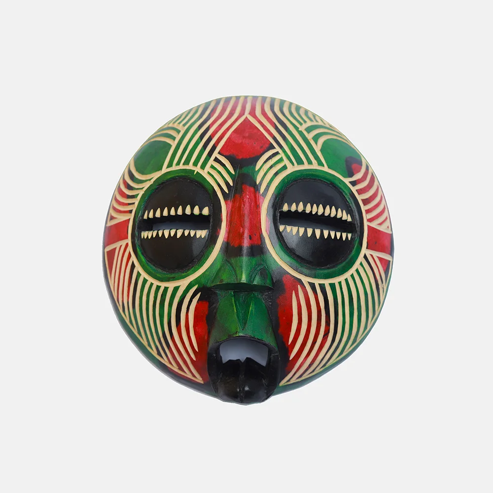Ghanaian Round masks are typically made of wood and often feature a combination of geometric patterns, bold shapes, and symbolic elements. They are known for their association with well-being, harmony, and ancestral connections, often used in ceremonies and celebrations. The masks can vary in size and may incorporate intricate beadwork or other decorative elements like brass triangles. Here’s a more detailed look: Shape and Design: • Circular or round: The most defining characteristic is their rounded shape, which can vary in size and depth. • Geometric patterns: Many masks feature etched or carved geometric designs, sometimes arranged in a grid-like pattern. • Symbolic features: They often incorporate elements like slit eyes, protruding tongues, or abstracted facial features, each carrying specific symbolic meaning. Materials and Decoration: • Wood: The masks are primarily crafted from wood. • Beadwork: Some masks, particularly those from the Ashanti region, feature intricate beadwork in various colors. • Brass and other embellishments: Brass triangles, or other decorative elements, may also be incorporated. Cultural Significance: • Ceremonial use: Round masks are frequently used in ceremonies, festivals, and masquerade performances. • Spiritual connection: They are believed to facilitate communication with ancestors or spirits, bridging the gap between the physical and spiritual realms. • Symbolism of well-being: The masks often represent positive concepts like well-being, harmony, and prosperity. • Ashanti and Baule influence: Some masks, like those from the Ashanti region, showcase Baule sculpture styles and symbolism related to beauty and refinement