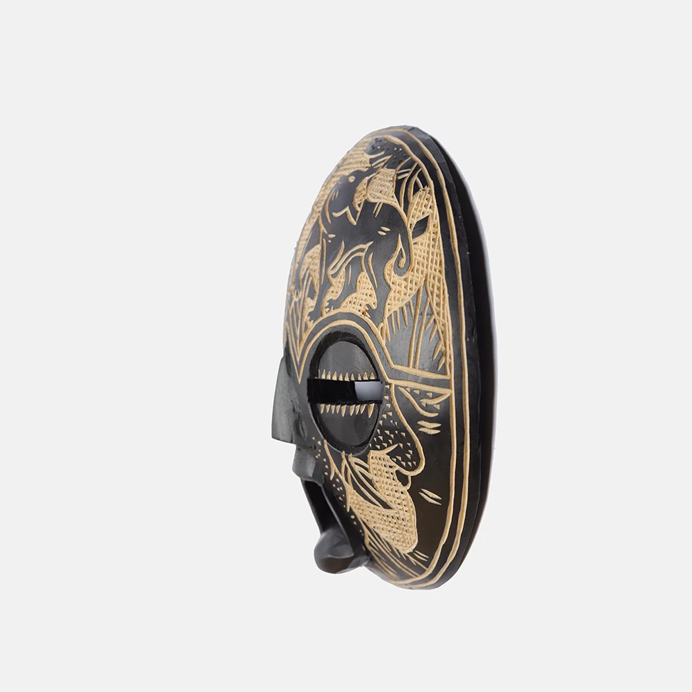 Ghanaian Round masks are typically made of wood and often feature a combination of geometric patterns, bold shapes, and symbolic elements. They are known for their association with well-being, harmony, and ancestral connections, often used in ceremonies and celebrations. The masks can vary in size and may incorporate intricate beadwork or other decorative elements like brass triangles. Here’s a more detailed look: Shape and Design: • Circular or round: The most defining characteristic is their rounded shape, which can vary in size and depth. • Geometric patterns: Many masks feature etched or carved geometric designs, sometimes arranged in a grid-like pattern. • Symbolic features: They often incorporate elements like slit eyes, protruding tongues, or abstracted facial features, each carrying specific symbolic meaning. Materials and Decoration: • Wood: The masks are primarily crafted from wood. • Beadwork: Some masks, particularly those from the Ashanti region, feature intricate beadwork in various colors. • Brass and other embellishments: Brass triangles, or other decorative elements, may also be incorporated. Cultural Significance: • Ceremonial use: Round masks are frequently used in ceremonies, festivals, and masquerade performances. • Spiritual connection: They are believed to facilitate communication with ancestors or spirits, bridging the gap between the physical and spiritual realms. • Symbolism of well-being: The masks often represent positive concepts like well-being, harmony, and prosperity. • Ashanti and Baule influence: Some masks, like those from the Ashanti region, showcase Baule sculpture styles and symbolism related to beauty and refinement