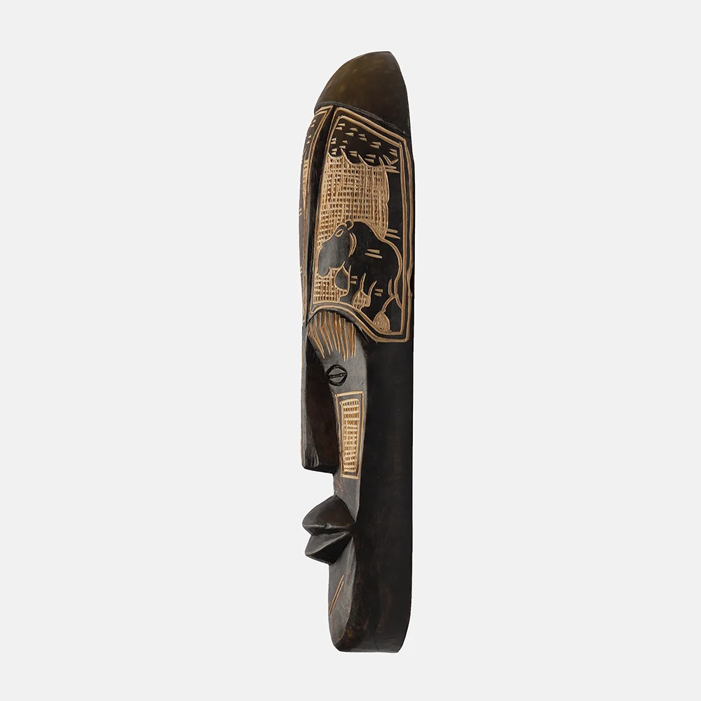 Senufo masks from Ghana, especially those used by the Poro society, are intricately crafted wooden masks employed in important ceremonies such as funerals and initiation rites. These masks are made in two primary forms: the smaller, feminine-style kpeliye’e face masks and the larger, more elaborate kponyugu or “firespitter” helmet masks. Details: Kpeliye’e Masks These are small, oval-shaped face masks that exhibit refined, feminine aesthetics. They often feature symmetrical designs, geometric projections, smooth contours, and raised scarification patterns. Though feminine in appearance, they are worn by men and primarily serve to honor deceased Senufo elders during ceremonial rituals. Kponyugu (Firespitter) Masks These are larger, full-head helmet masks with aggressive and complex compositions, combining elements from multiple animals—such as buffalo, crocodiles, antelope, warthogs, birds, and sometimes chameleons. Their intimidating features are meant to scare away evil spirits and protect the deceased’s soul during funerals. Cultural Significance: Ceremonial Function Both mask types play essential roles in the secretive Poro society, where they are used in spiritual and social rituals like initiations and funerals. They are kept hidden from those not initiated into the society and are revealed only during specific sacred ceremonies. Symbolism and Belief These masks are deeply symbolic, rooted in Senufo spiritual beliefs and cosmology. They reflect themes of nature, ancestral power, and the animal world, with each component of the mask carrying a specific meaning tied to mythology or traditional knowledge. Artistry and Materials The masks are hand-carved with exceptional attention to detail, using a blend of materials such as wood, horn, cotton cloth, feathers, raffia fibers, and occasionally items used in ritual sacrifices. Each mask is a unique work of art, reflecting both the spiritual and aesthetic values of the Senufo people.