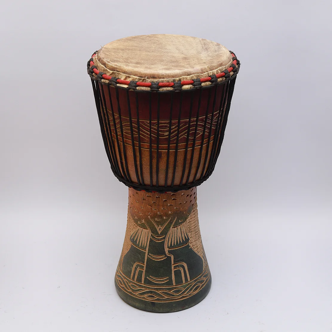 A djembe is a traditional West African goblet-shaped drum, skillfully hand-carved from a single piece of hardwood and topped with a tightly stretched animal skin, usually goat. Known for its broad range of tones—deep bass, mid-range tones, and sharp slaps—it is played with bare hands and used in a wide variety of cultural, ceremonial, and musical settings. Key Characteristics: Shape & Construction: The djembe has a goblet-like shape with a wide top and narrow base, carved from durable woods like Mansonia. Drum Head: The head is typically made of goatskin, stretched and held in place using a rope tuning system that also allows for tonal adjustments. Playing Technique: Played with bare hands, the djembe can produce diverse sounds based on striking technique and hand placement. Decorative Carvings: Many djembes feature intricate hand-carved designs on the wooden body, reflecting the artisan’s region or cultural influences. Versatility: Used for traditional ceremonies, modern performances, dance accompaniment, and storytelling. Crafting Process: Wood Selection: A solid, resonant hardwood is selected. Shaping: The wood is carved into a goblet shape using hand tools or machines. Detailing: Artistic carvings are added to enhance aesthetic and cultural value. Skin Preparation: Goat skin is cleaned, dried, and stretched over the drum top. Rope Work: Rope is laced in a specific pattern to hold and tune the drumhead. Finishing: The drum is sealed with oil or varnish to protect it. Cultural Significance: Originating in countries like Mali, the djembe is more than just an instrument—it’s a symbol of community, unity, and communication. The name “djembe” is believed to come from the Bamana saying “Anke djé, anke bé,” meaning “everyone gather together in peace,” highlighting the drum’s role in social cohesion.
