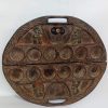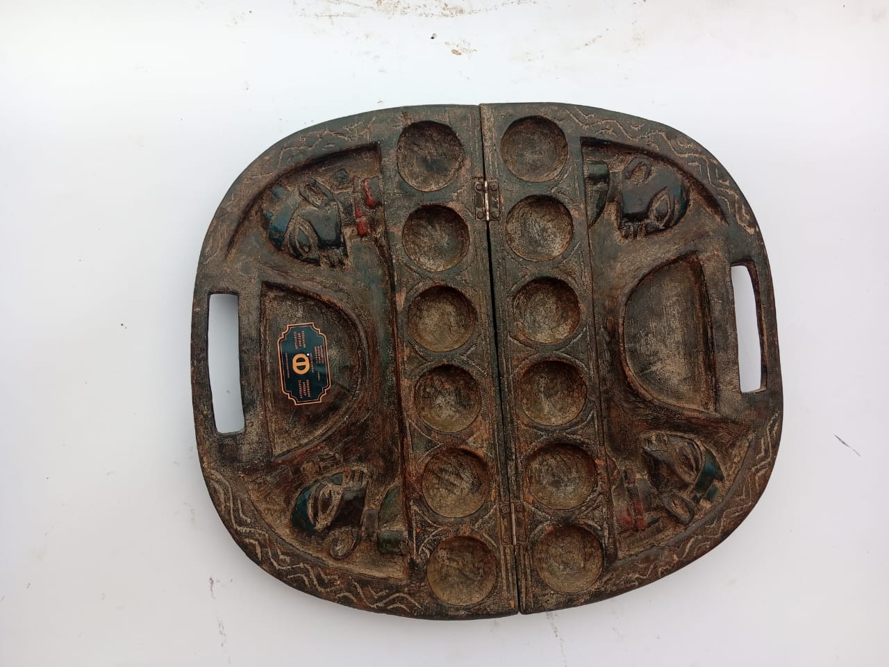 Carved Wooden Oware A carved wooden Oware is a traditional West African board game, hand-crafted from wood and considered one of the oldest variants of the global Mancala family of games. Popular across Ghana and other parts of Africa, Oware is not only a pastime but a cultural artifact, reflecting both artistic craftsmanship and deep-rooted heritage. Key Features and Significance: Mancala Tradition: Oware is a Mancala-style game, where players “sow” and “capture” seeds placed in a set of pits carved into the board. It typically includes 12 pits and is played with small stones, seeds, or beads. Hand-Carved Craftsmanship: Artisans skillfully carve Oware boards from durable woods, sometimes featuring ornate detailing, cultural symbols like Adinkra, and unique finishes that make each board distinct. Cultural and Social Value: Beyond entertainment, Oware is a social tool, often played during gatherings and community events. It symbolizes wisdom, patience, and strategy, values highly respected in African societies. Educational Benefits: Oware helps enhance arithmetic, strategic thinking, and problem-solving skills, making it both a recreational and educational game suitable for all ages. Portable Designs: Some versions of the board are foldable with built-in storage for seeds, offering convenience for travel or everyday use. Ethical Sourcing: Many carved Oware sets are produced under fair trade practices, supporting local artisans and preserving traditional craftsmanship.