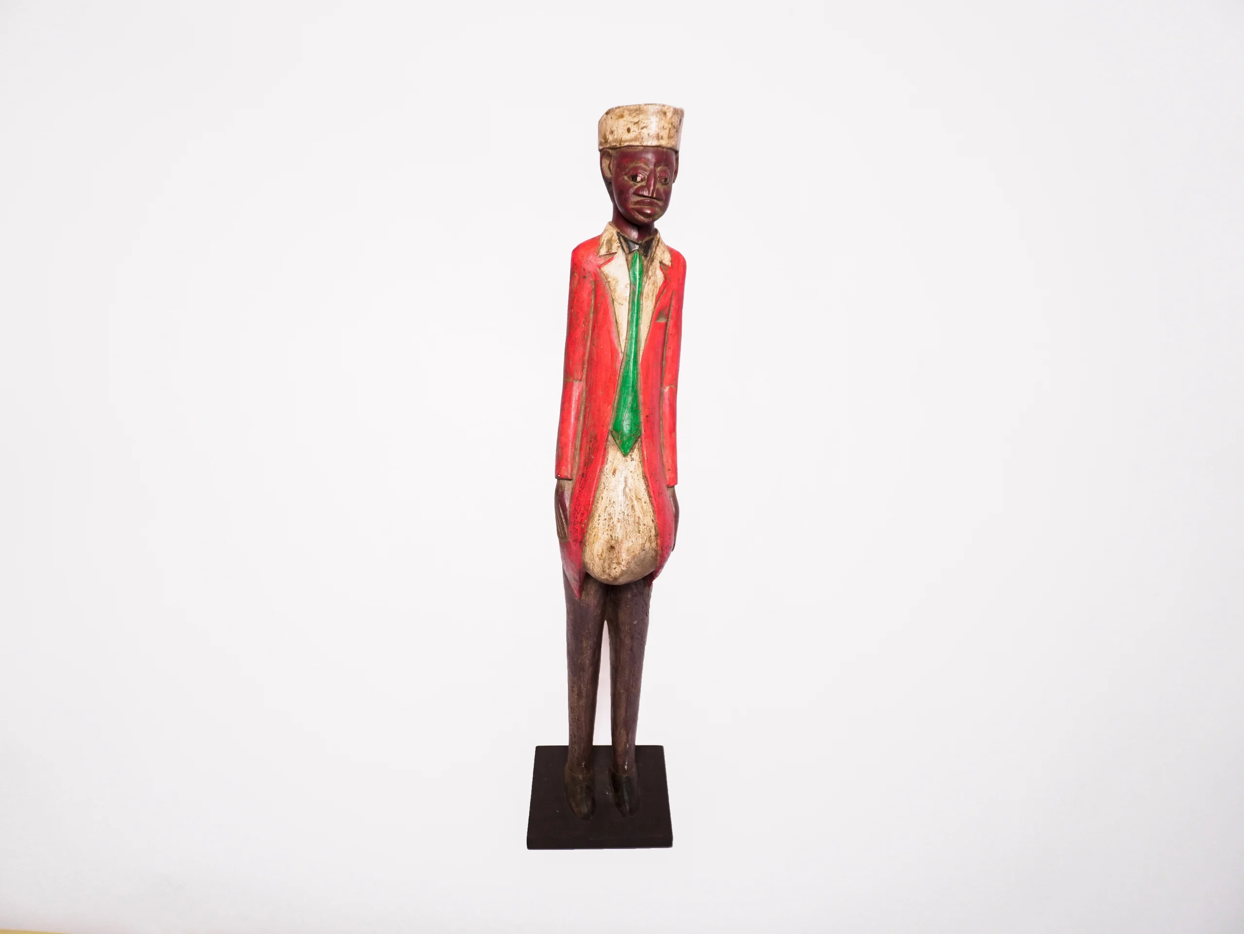 Carved Wooden Colon – A Cultural Fusion of Art and Colonial History Carved wooden colons, also known as “colon statues,” are distinctive anthropomorphic sculptures that originated in West Africa—especially in the Ivory Coast—during the colonial era. These figures are typically handcrafted from wood and brightly painted, portraying Europeans such as colonial officers, missionaries, or civil servants. They are notable for their unique blend of traditional African carving styles and European themes, making them powerful symbols of cultural intersection. Defining Characteristics: Depiction of Europeans: Colon statues often feature European subjects dressed in formal colonial attire, such as military uniforms, suits, hats, or clerical garments. These figures are portrayed with exaggerated or stylized features, highlighting the contrast between cultures. Stylistic Fusion: The artistry combines African sculptural techniques—like bold shapes, simplified forms, and symbolic proportions—with European details in clothing and posture, creating a visually striking hybrid style. Materials and Finish: Typically carved from hardwood and finished with vibrant, glossy paint, the figures are made to be both eye-catching and durable. Their colorful appearance adds a whimsical or satirical tone to the serious historical themes they represent. Cultural and Historical Significance: Commentary on Colonialism: These statues are seen by many scholars and collectors as a form of visual commentary or satire. They reflect how African artists perceived and interpreted colonial figures, sometimes idealizing, sometimes mocking, or simply documenting them. Symbol of Cultural Hybridity: Colon statues embody the blending of African traditions and foreign influences. They illustrate how African societies adapted to and represented the presence of European powers. Context of Use: While some colon figures were created as functional art for local rituals or as household items, many were produced for trade and tourism. Their popularity grew as collectible souvenirs that offered a uniquely African perspective on colonial presence. Legacy and Art Market: Today, carved wooden colons are appreciated not only for their historical significance but also for their artistic and cultural value. They are featured in art galleries, museums, and private collections around the world, celebrated as enduring artifacts of colonial-era West Africa and as bold expressions of resistance, adaptation, and artistic innovation.