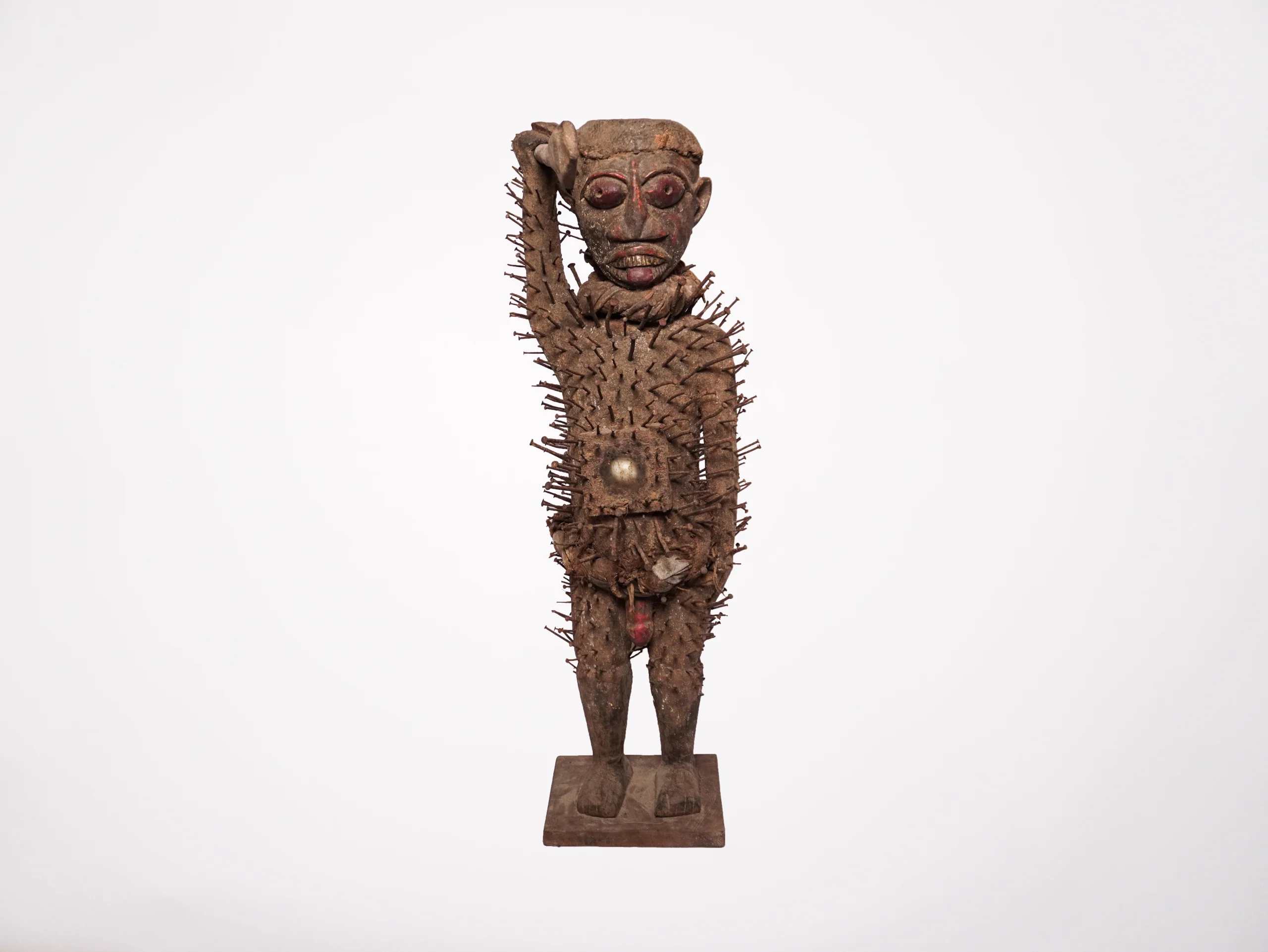 Carved Wooden Fetish Statue – Sacred Art with Spiritual Power A carved wooden fetish statue is a spiritually significant figure, often representing a human or animal form, believed to hold magical or divine power. Found in various cultural traditions—especially in parts of Africa and among Native American tribes—these statues are not merely artistic pieces but are treated as sacred objects of worship, protection, or healing. Key Features and Cultural Role: Spiritual Purpose: Fetish statues are believed to be vessels for spiritual forces or ancestral spirits. They are often used in rituals to invoke protection, attract blessings, offer healing, or ward off malevolent energies. Material and Craftsmanship: Although fetish figures can be made from bone, stone, or other natural materials, many are skillfully carved from wood. The craftsmanship may include added elements such as beads, cloth, feathers, nails, or mirrors—each holding symbolic meaning or enhancing the statue’s spiritual potency. Cultural Contexts: African Traditions: Among the Kongo and other Central African groups, fetish figures—known as nkisi or nkondi—are used in religious ceremonies. These statues may be activated with prayers, herbs, or other substances and often feature dramatic elements like iron nails or glass to symbolize power, action, and reflection. Zuni Fetishes (Native American): In Zuni tradition, fetishes are small carved animals that embody the spirit and attributes of the creature they represent. These sacred items are treated with great reverence, kept in special containers, and offered cornmeal or other gifts. They are sometimes blessed by spiritual leaders to reinforce their energy and protective function. Community Use vs. Commercial Art: While modern interpretations of fetish figures are sold as art or collectibles, authentic fetish carvings are typically kept within the community and used in spiritual practice—not intended for public display or commercial sale.