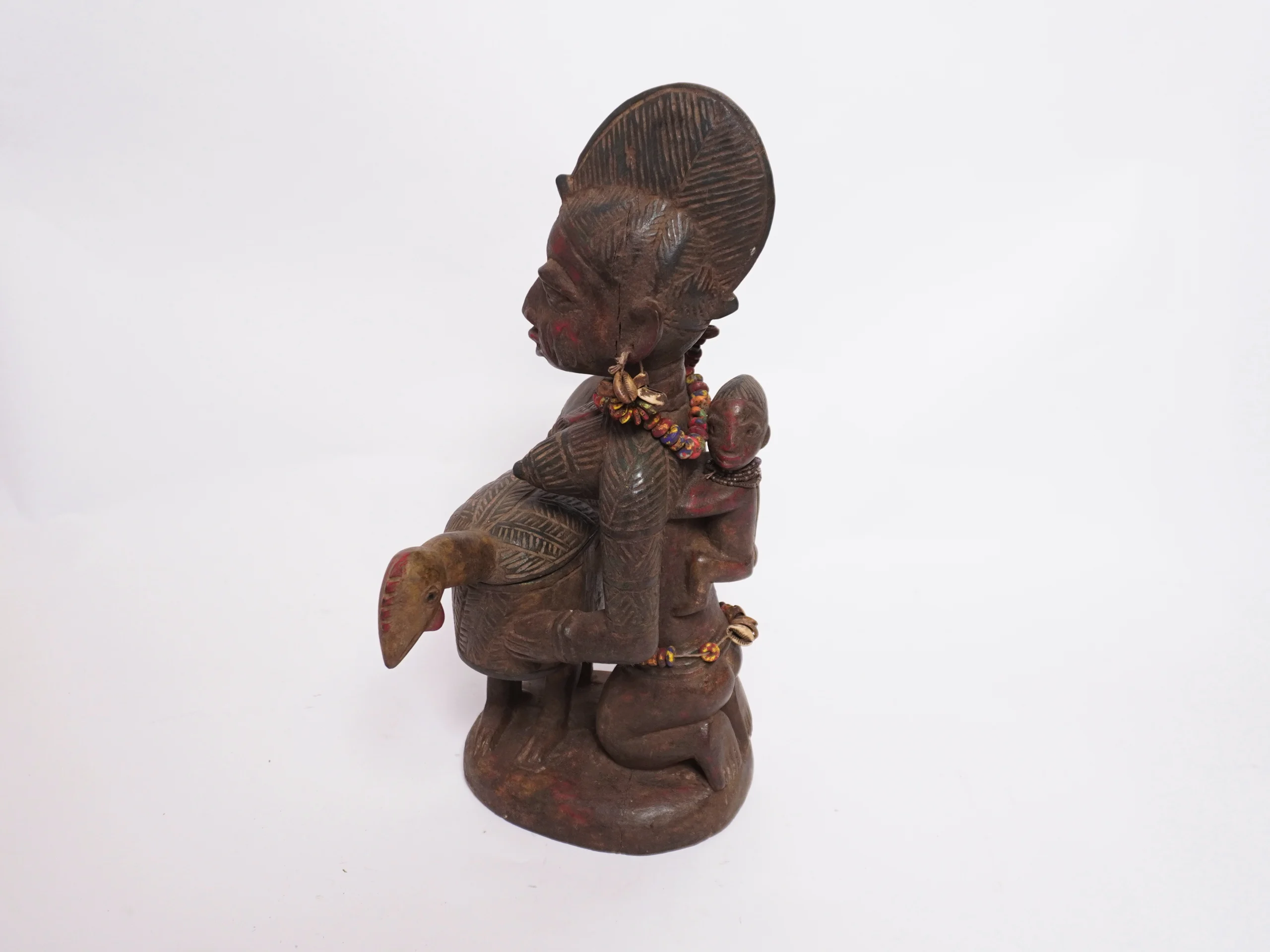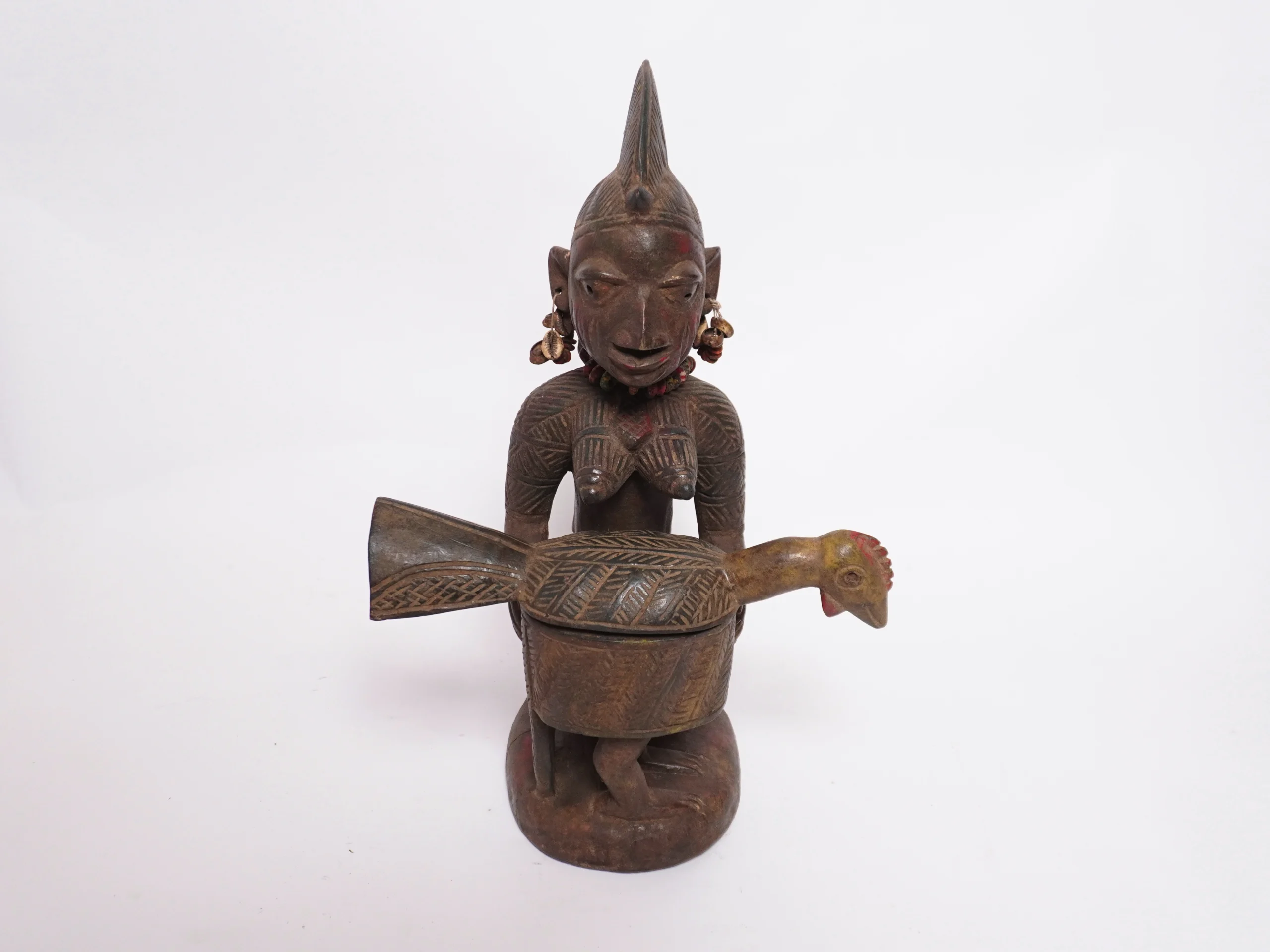 Ibeji Statue – Sacred Twin Memorials of the Yoruba People An Ibeji statue, also known as Ere Ibeji, is a hand-carved wooden figure created by the Yoruba people of Nigeria and Benin to honor a deceased twin. These statues are deeply spiritual artifacts—not merely decorative items—and serve as physical vessels for the spirit of a lost twin, ensuring their continued presence within the family. Cultural Context and Purpose: Spiritual Role of Twins: In Yoruba belief, twins (called Ibeji) are considered spiritually powerful and bring both blessing and potential risk to a family. When one or both twins pass away, an Ibeji statue is commissioned to house the spirit of the departed child. This practice helps preserve harmony in the family and maintain a connection with the spiritual world. Design and Appearance: Ibeji statues typically feature a stylized human form that represents an idealized adult version of the deceased twin. These figures often display carefully detailed features, including elaborate hairstyles, symmetrical bodies, and accessories like cowrie shells, colorful beads, or carved ornaments symbolizing wealth, beauty, and status. The figures may be painted using natural pigments, such as indigo, to enhance their spiritual presence. Ritual Use and Daily Care: The Ibeji is treated as a living entity. Families—especially the mother and surviving twin, if applicable—regularly wash, clothe, adorn, and even symbolically feed the statue as part of daily rituals. This care is believed to bring protection, prosperity, and blessings to the household. Symbolic Meaning: Beyond memorialization, the Ibeji figure represents the Yoruba’s deep reverence for twins and their belief in the ongoing bond between the physical and spiritual realms. The statue ensures the twin’s spirit is honored and remains a part of the family’s life.