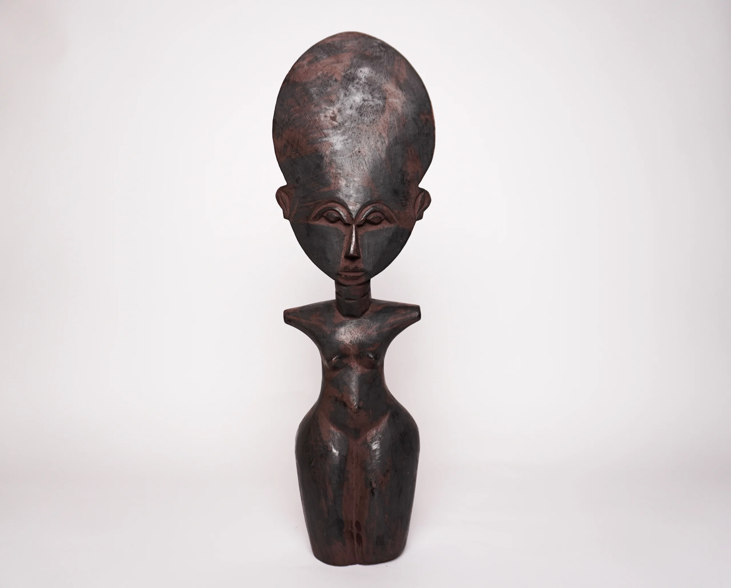 HALF BODY DOLL In Ghana, traditional sculpture—often centered on the head and torso—is a powerful form of cultural and artistic expression. These figures, sometimes referred to as “half body statues,” reflect deep symbolic meaning rather than striving for anatomical precision. Key Characteristics of Ghanaian Half-Body Sculptures: ⦁ Emphasis on the Head: The head is typically rendered disproportionately large, symbolizing its importance as the center of wisdom, vitality, and survival. ⦁ Simplified Limbs: Limbs such as arms and legs, if included, are often minimally detailed, drawing focus instead to the head and torso. ⦁ Essential Form Over Realism: These sculptures aim to capture the spiritual or symbolic essence of the subject rather than depict a realistic human form. ⦁ Proportional Symbolism: Exaggerated or minimized body parts are used intentionally to convey their cultural and spiritual significance. ⦁ Materials Used: While wood is the most common medium, artisans also work with clay, bronze, and stone to bring these figures to life. ⦁ Traditional Craftsmanship: Artists typically use tools like axes and adzes for carving, complemented by finishing techniques such as polishing, charring, or painting to enhance the final piece. Examples: ⦁ Akua’ba Figures: These stylized fertility dolls feature cylindrical torsos, wide horizontal arms, and large circular heads, often resting on a flat base instead of legs. They symbolize fertility and are traditionally used by women hoping to conceive. ⦁ Nsodie (Memorial Heads): Often made of terracotta, these busts commemorate the deceased and range from realistic portraits to abstract representations. They serve as vessels of remembrance and ancestral reverence. Cultural Significance: ⦁ Preserving Heritage: These sculptures are a vital part of Ghana’s cultural heritage, passed down through generations as symbols of identity and tradition. ⦁ Spiritual and Social Roles: Half-body figures are used in rituals related to fertility, ancestor worship, mourning, and social rites, making them essential elements in Ghanaian religious and communal life. ⦁ Artistic Expression: Ghanaian sculptors blend traditional techniques with cultural storytelling, producing works that are both meaningful and visually compelling. Note: While “half body statue” is not a widely used formal term, it effectively describes a category of Ghanaian sculptures that emphasize the head and torso as the primary elements of expression and symbolism.