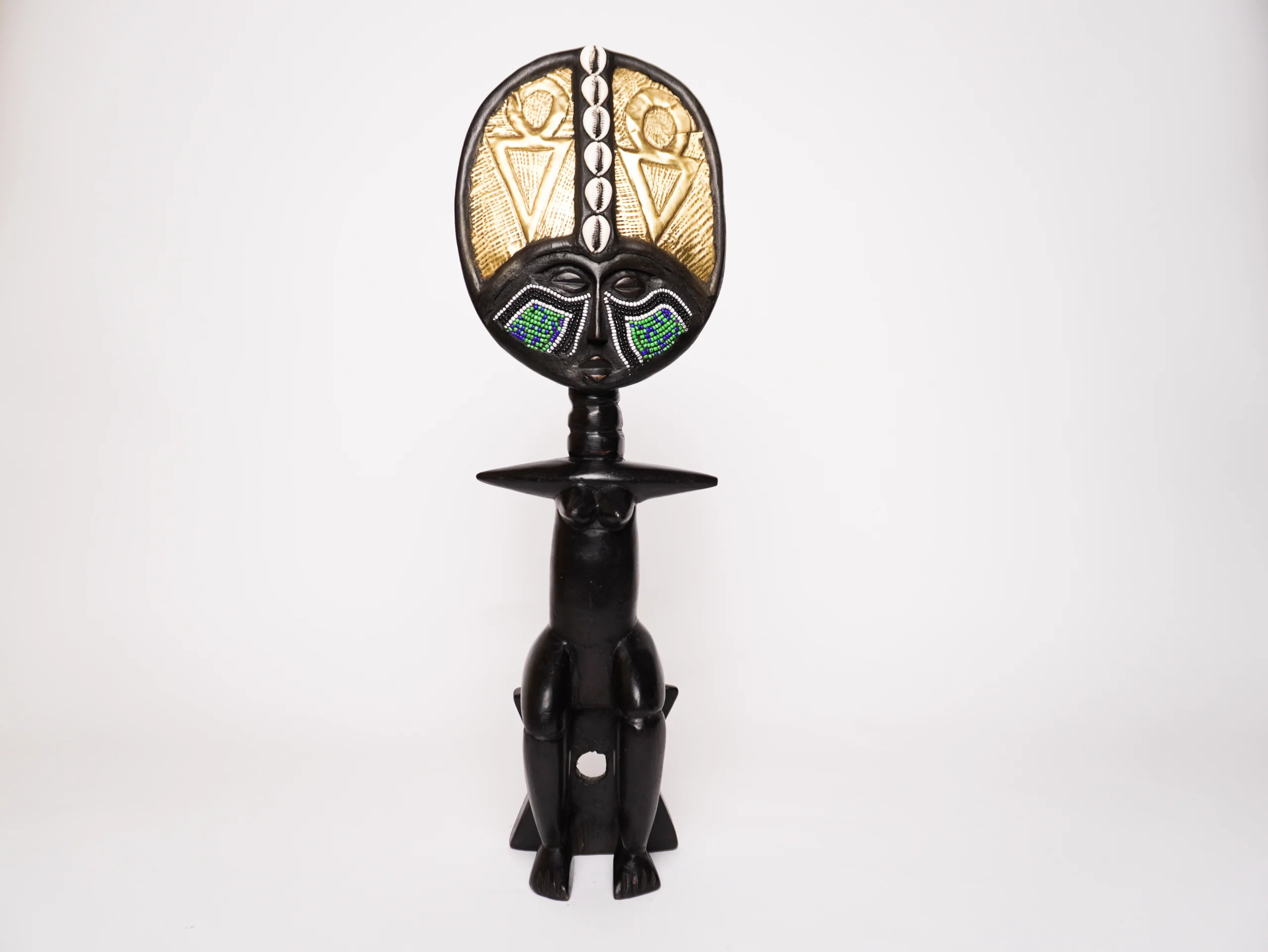 Ghana Wooden Ashanti Sitting Doll (Akua’ba Figure) The Ghana wooden Ashanti sitting doll, commonly known as an Akua’ba (or Akua’ba figure), is a traditional fertility sculpture originating from the Akan people, particularly the Ashanti of Ghana. These handcrafted wooden dolls are not simple playthings—they hold deep spiritual and cultural importance, especially for women desiring children or seeking safe childbirth. Detailed Overview: Symbolic Purpose: Akua’ba dolls are revered as fertility symbols, believed to help women conceive and carry a pregnancy successfully. They are often part of rituals and prayers related to motherhood and family blessings. Distinctive Appearance: These figures are easily recognized by their flat, disc-shaped heads, high foreheads, and ringed necks—all representing traditional ideals of beauty and prosperity. The body is typically column-like, with short, outstretched arms and subtle feminine features. Cultural Practice: Traditionally, women carry the doll on their backs wrapped in cloth—mimicking how a baby is held. This ritual act symbolizes care, devotion, and hope for motherhood. The belief is that treating the doll with love and respect will bring good fortune and healthy offspring. Beyond Fertility: Akua’ba dolls also serve as educational tools for young girls, helping them learn nurturing behaviors by observing how mothers interact with the figures. After childbirth, some dolls are passed down to children as cherished toys, continuing their life as symbols of protection and growth. Design Variations: While most Akua’ba dolls feature the classic disc-like head, variations exist—some may have rounded heads or depict mother-and-child figures, reinforcing the doll’s connection to maternal care and the family unit.