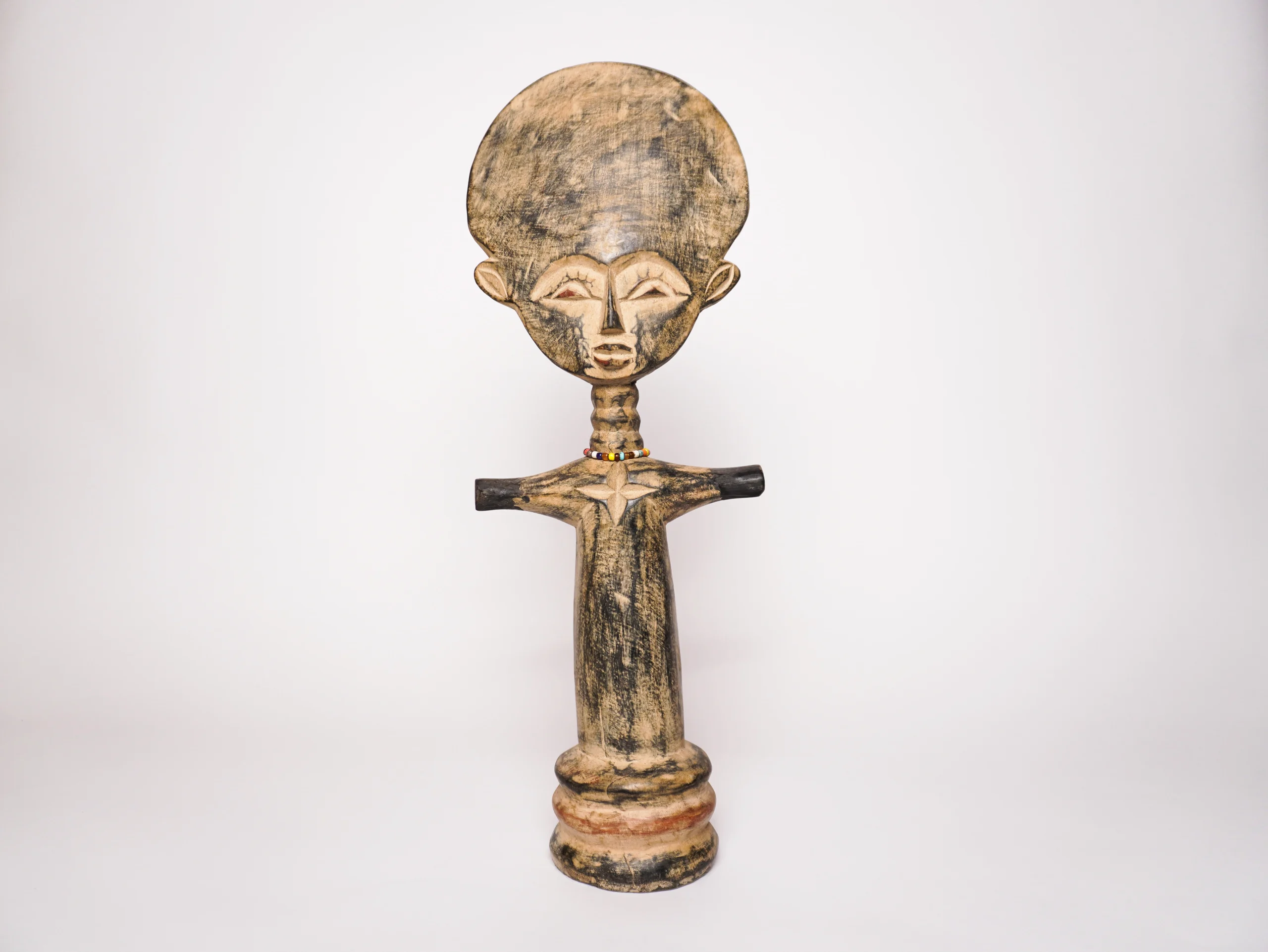 Ghana Ashanti Doll (Akua’ba) Among the Ashanti people of Ghana, the Akua’ba doll—also spelled Akwa’ba or Akuaba—is a cherished cultural symbol. These wooden figures are far more than playthings; they serve as powerful fertility charms, believed to help women conceive and ensure the birth of a healthy and beautiful child. Traditionally, the doll is carried on a woman’s back, just like a real baby, as part of spiritual practice. Key Features of the Akua’ba Doll: ⦁ Distinctive Disc-Shaped Head: The most recognizable feature of the Akua’ba doll is its large, flat, circular head, symbolizing ideal beauty in Ashanti culture. ⦁ Stylized Female Form: The doll’s body is abstract and elongated, with a cylindrical torso, short, outstretched arms, and a neck adorned with carved rings—representing femininity and grace. ⦁ Crafted from Wood: Typically carved from local hardwoods such as ebony, each doll is shaped by hand using traditional techniques passed down through generations. ⦁ Ritual Use: Akua’ba dolls are used in fertility rites and ceremonies, particularly by women hoping to conceive. They are bathed, clothed, and cared for as though they were living children. ⦁ Symbolism: Beyond their role in fertility, these dolls represent the Ashanti ideal of beauty and have come to symbolize good fortune, protection, and well-being. ⦁ Cultural Practice: Women of childbearing age carry the dolls on their backs in a cloth wrap, mirroring how real infants are carried, as a way to invite the blessing of motherhood. Origin Story and Spiritual Belief: The tradition of the Akua’ba doll is tied to the story of a woman named Akua, who struggled with infertility. After seeking the help of a spiritual priest, she was advised to have a wooden doll made and carry it as if it were her own child. Following this ritual faithfully, she eventually conceived, and the practice became part of Ashanti tradition. The name “Akua’ba” means “Akua’s child” in the Akan language. Today, the Akua’ba doll remains a celebrated icon of Ghanaian heritage, valued for both its spiritual meaning and its elegant, symbolic design. It stands as a timeless representation of hope, beauty, fertility, and cultural pride.