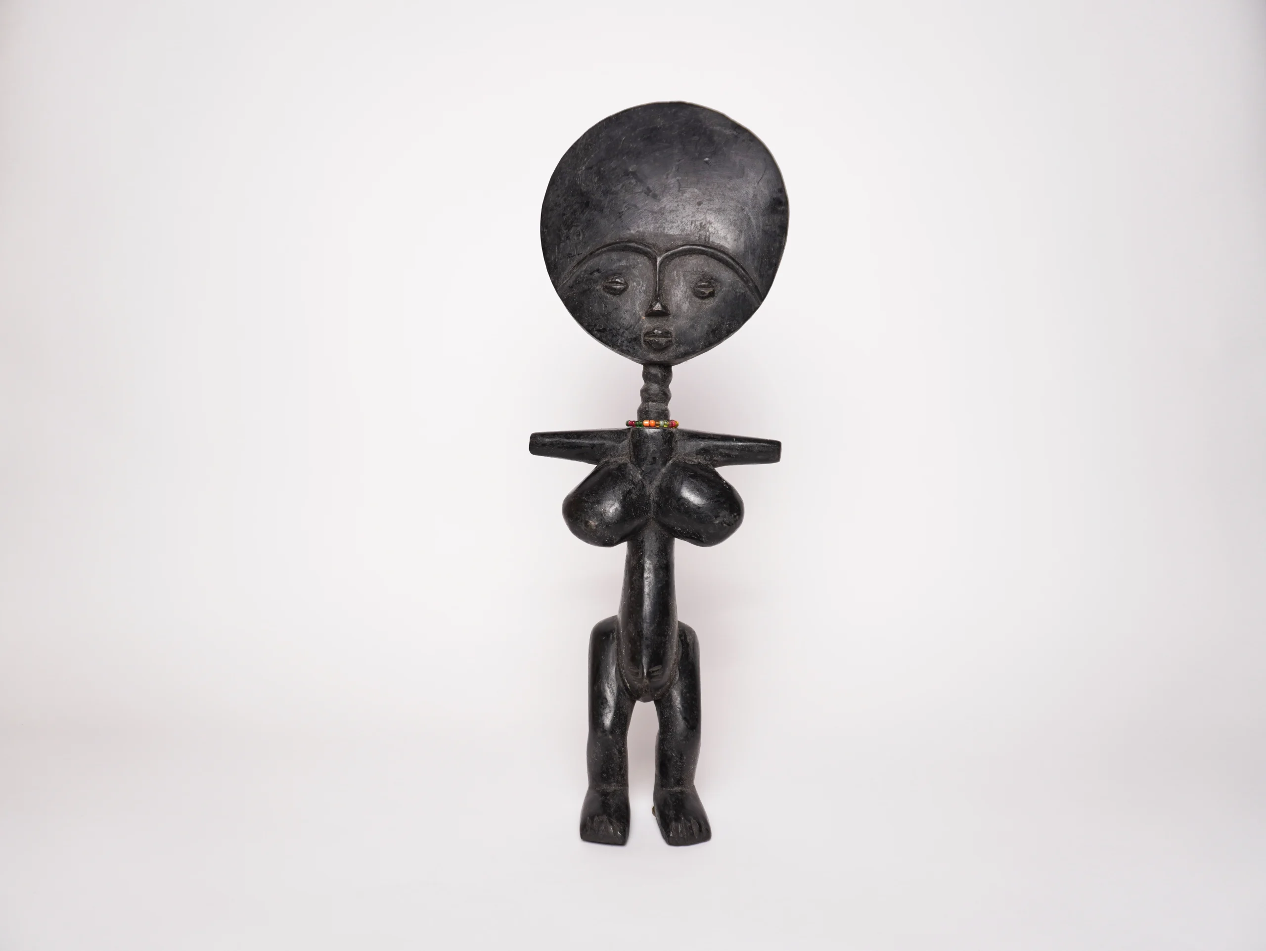 Ghana Ashanti Doll (Akua’ba) Among the Ashanti people of Ghana, the Akua’ba doll—also spelled Akwa’ba or Akuaba—is a cherished cultural symbol. These wooden figures are far more than playthings; they serve as powerful fertility charms, believed to help women conceive and ensure the birth of a healthy and beautiful child. Traditionally, the doll is carried on a woman’s back, just like a real baby, as part of spiritual practice. Key Features of the Akua’ba Doll: Distinctive Disc-Shaped Head: The most recognizable feature of the Akua’ba doll is its large, flat, circular head, symbolizing ideal beauty in Ashanti culture. Stylized Female Form: The doll’s body is abstract and elongated, with a cylindrical torso, short, outstretched arms, and a neck adorned with carved rings—representing femininity and grace. Crafted from Wood: Typically carved from local hardwoods such as ebony, each doll is shaped by hand using traditional techniques passed down through generations. Ritual Use: Akua’ba dolls are used in fertility rites and ceremonies, particularly by women hoping to conceive. They are bathed, clothed, and cared for as though they were living children. Symbolism: Beyond their role in fertility, these dolls represent the Ashanti ideal of beauty and have come to symbolize good fortune, protection, and well-being. Cultural Practice: Women of childbearing age carry the dolls on their backs in a cloth wrap, mirroring how real infants are carried, as a way to invite the blessing of motherhood. Origin Story and Spiritual Belief: The tradition of the Akua’ba doll is tied to the story of a woman named Akua, who struggled with infertility. After seeking the help of a spiritual priest, she was advised to have a wooden doll made and carry it as if it were her own child. Following this ritual faithfully, she eventually conceived, and the practice became part of Ashanti tradition. The name “Akua’ba” means “Akua’s child” in the Akan language.