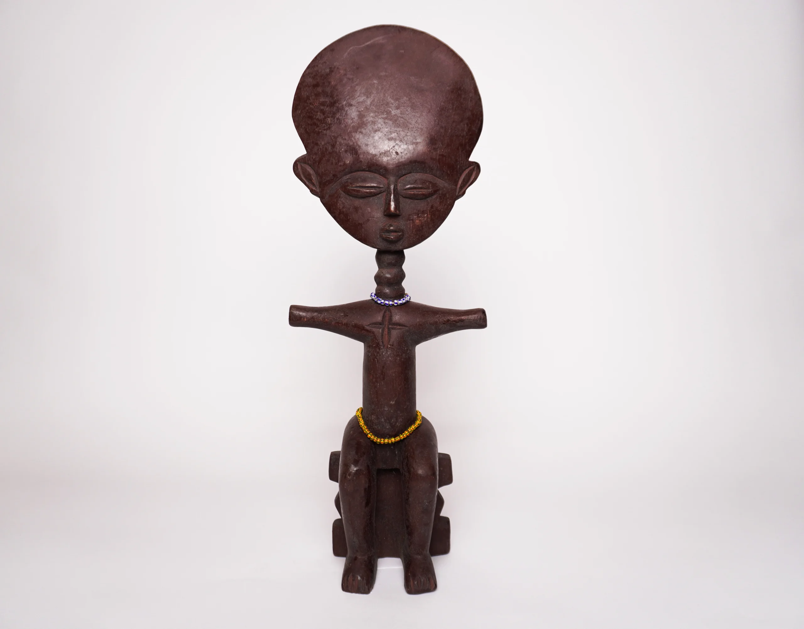 Ghana Wooden Ashanti Sitting Doll (Akua’ba Figure) The Ghana wooden Ashanti sitting doll, commonly known as an Akua’ba (or Akua’ba figure), is a traditional fertility sculpture originating from the Akan people, particularly the Ashanti of Ghana. These handcrafted wooden dolls are not simple playthings—they hold deep spiritual and cultural importance, especially for women desiring children or seeking safe childbirth. Detailed Overview: Symbolic Purpose: Akua’ba dolls are revered as fertility symbols, believed to help women conceive and carry a pregnancy successfully. They are often part of rituals and prayers related to motherhood and family blessings. Distinctive Appearance: These figures are easily recognized by their flat, disc-shaped heads, high foreheads, and ringed necks—all representing traditional ideals of beauty and prosperity. The body is typically column-like, with short, outstretched arms and subtle feminine features. Cultural Practice: Traditionally, women carry the doll on their backs wrapped in cloth—mimicking how a baby is held. This ritual act symbolizes care, devotion, and hope for motherhood. The belief is that treating the doll with love and respect will bring good fortune and healthy offspring. Beyond Fertility: Akua’ba dolls also serve as educational tools for young girls, helping them learn nurturing behaviors by observing how mothers interact with the figures. After childbirth, some dolls are passed down to children as cherished toys, continuing their life as symbols of protection and growth. Design Variations: While most Akua’ba dolls feature the classic disc-like head, variations exist—some may have rounded heads or depict mother-and-child figures, reinforcing the doll’s connection to maternal care and the family unit.