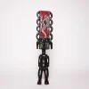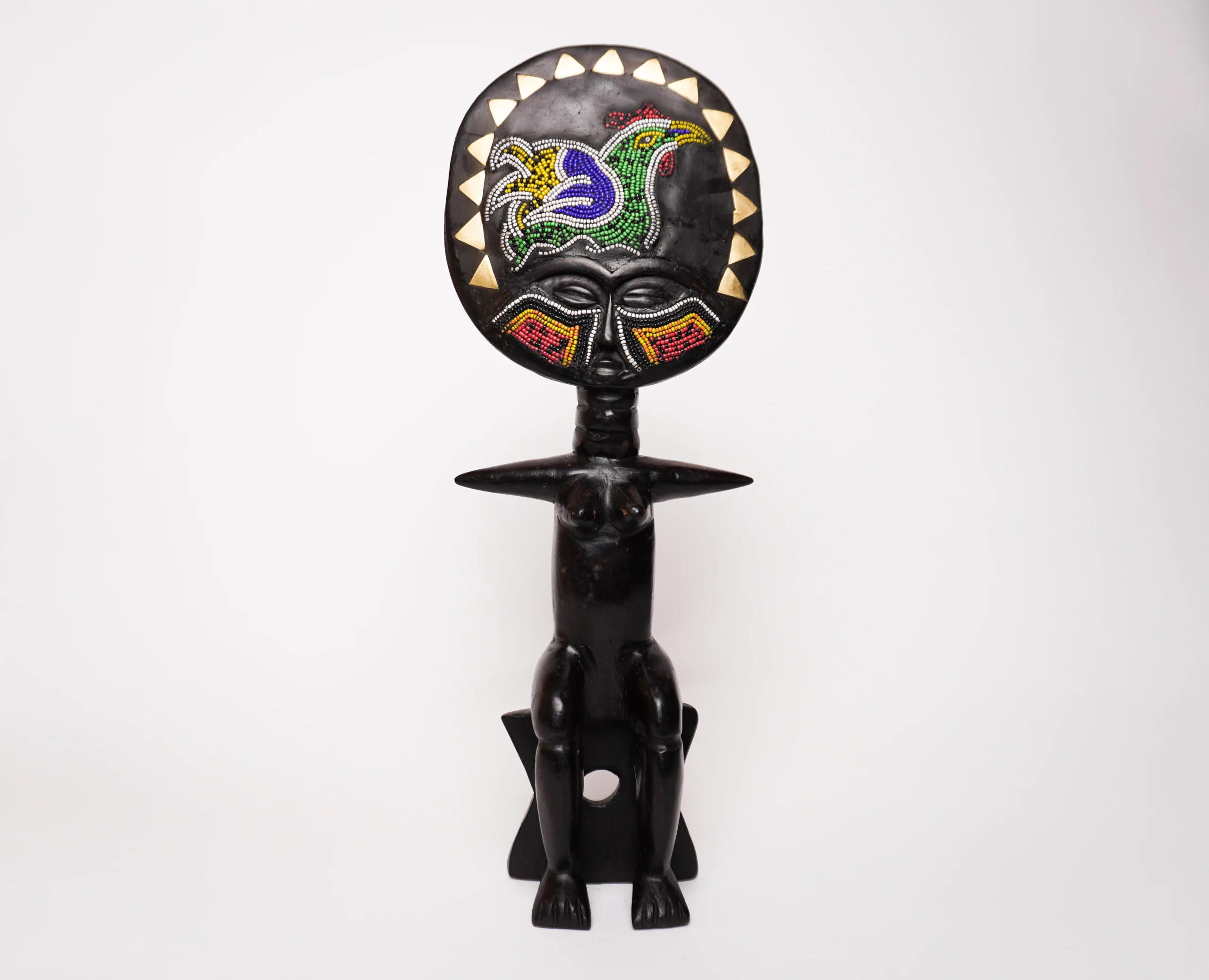 Ghana Wooden Ashanti Sitting Doll (Akua’ba Figure) The Ghana wooden Ashanti sitting doll, commonly known as an Akua’ba (or Akua’ba figure), is a traditional fertility sculpture originating from the Akan people, particularly the Ashanti of Ghana. These handcrafted wooden dolls are not simple playthings—they hold deep spiritual and cultural importance, especially for women desiring children or seeking safe childbirth. Detailed Overview: Symbolic Purpose: Akua’ba dolls are revered as fertility symbols, believed to help women conceive and carry a pregnancy successfully. They are often part of rituals and prayers related to motherhood and family blessings. Distinctive Appearance: These figures are easily recognized by their flat, disc-shaped heads, high foreheads, and ringed necks—all representing traditional ideals of beauty and prosperity. The body is typically column-like, with short, outstretched arms and subtle feminine features. Cultural Practice: Traditionally, women carry the doll on their backs wrapped in cloth—mimicking how a baby is held. This ritual act symbolizes care, devotion, and hope for motherhood. The belief is that treating the doll with love and respect will bring good fortune and healthy offspring. Beyond Fertility: Akua’ba dolls also serve as educational tools for young girls, helping them learn nurturing behaviors by observing how mothers interact with the figures. After childbirth, some dolls are passed down to children as cherished toys, continuing their life as symbols of protection and growth. Design Variations: While most Akua’ba dolls feature the classic disc-like head, variations exist—some may have rounded heads or depict mother-and-child figures, reinforcing the doll’s connection to maternal care and the family unit.