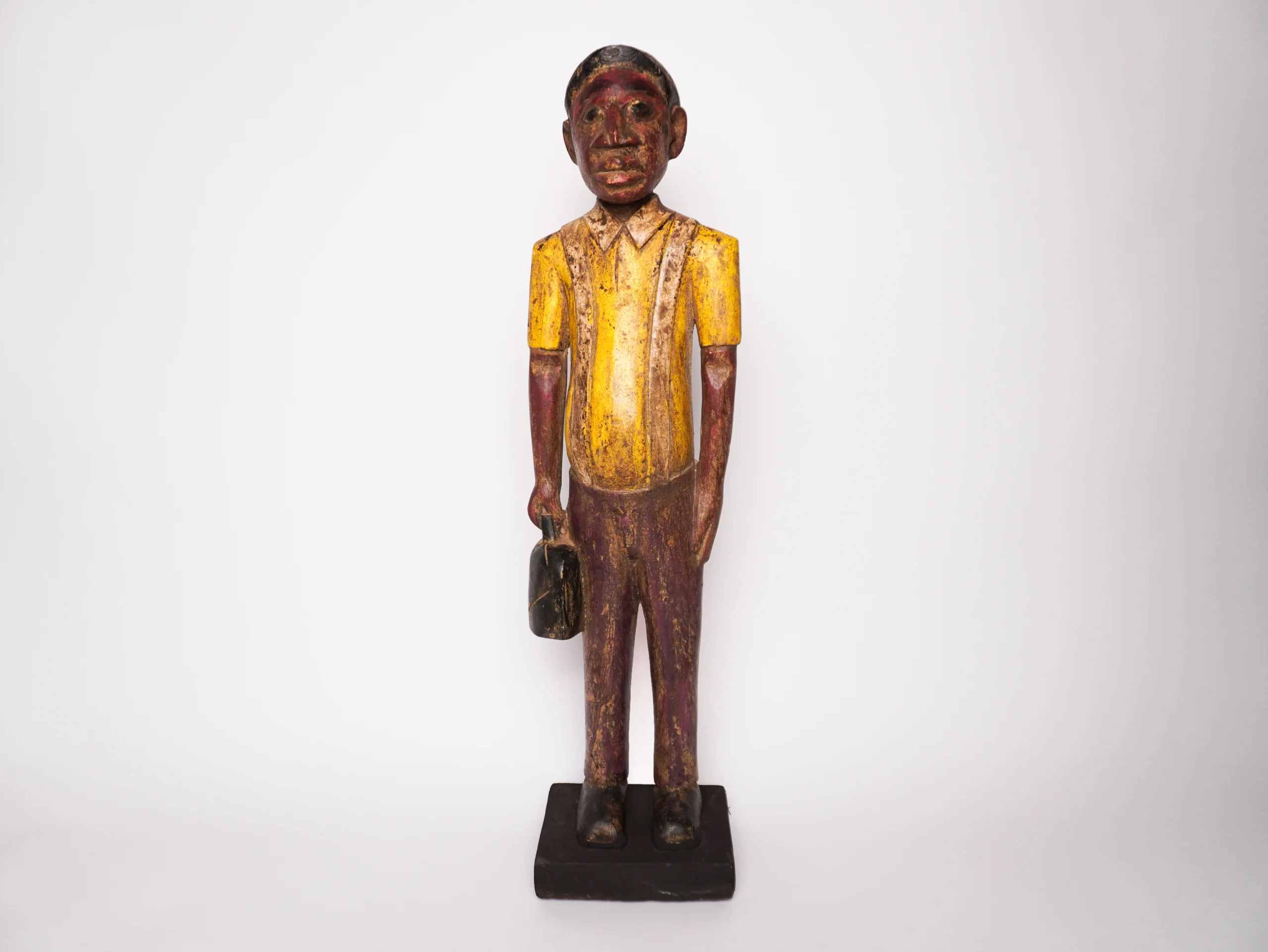 Carved Wooden Colon – A Cultural Fusion of Art and Colonial History Carved wooden colons, also known as “colon statues,” are distinctive anthropomorphic sculptures that originated in West Africa—especially in the Ivory Coast—during the colonial era. These figures are typically handcrafted from wood and brightly painted, portraying Europeans such as colonial officers, missionaries, or civil servants. They are notable for their unique blend of traditional African carving styles and European themes, making them powerful symbols of cultural intersection. Defining Characteristics: Depiction of Europeans: Colon statues often feature European subjects dressed in formal colonial attire, such as military uniforms, suits, hats, or clerical garments. These figures are portrayed with exaggerated or stylized features, highlighting the contrast between cultures. Stylistic Fusion: The artistry combines African sculptural techniques—like bold shapes, simplified forms, and symbolic proportions—with European details in clothing and posture, creating a visually striking hybrid style. Materials and Finish: Typically carved from hardwood and finished with vibrant, glossy paint, the figures are made to be both eye-catching and durable. Their colorful appearance adds a whimsical or satirical tone to the serious historical themes they represent. Cultural and Historical Significance: Commentary on Colonialism: These statues are seen by many scholars and collectors as a form of visual commentary or satire. They reflect how African artists perceived and interpreted colonial figures, sometimes idealizing, sometimes mocking, or simply documenting them. Symbol of Cultural Hybridity: Colon statues embody the blending of African traditions and foreign influences. They illustrate how African societies adapted to and represented the presence of European powers. Context of Use: While some colon figures were created as functional art for local rituals or as household items, many were produced for trade and tourism. Their popularity grew as collectible souvenirs that offered a uniquely African perspective on colonial presence. Legacy and Art Market: Today, carved wooden colons are appreciated not only for their historical significance but also for their artistic and cultural value. They are featured in art galleries, museums, and private collections around the world, celebrated as enduring artifacts of colonial-era West Africa and as bold expressions of resistance, adaptation, and artistic innovation.