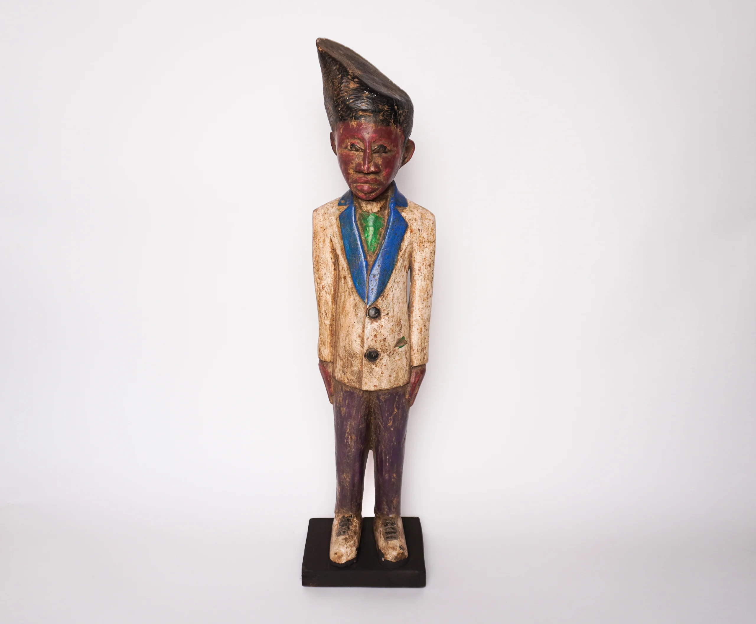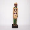 Carved Wooden Colon – A Cultural Fusion of Art and Colonial History Carved wooden colons, also known as “colon statues,” are distinctive anthropomorphic sculptures that originated in West Africa—especially in the Ivory Coast—during the colonial era. These figures are typically handcrafted from wood and brightly painted, portraying Europeans such as colonial officers, missionaries, or civil servants. They are notable for their unique blend of traditional African carving styles and European themes, making them powerful symbols of cultural intersection. Defining Characteristics: Depiction of Europeans: Colon statues often feature European subjects dressed in formal colonial attire, such as military uniforms, suits, hats, or clerical garments. These figures are portrayed with exaggerated or stylized features, highlighting the contrast between cultures. Stylistic Fusion: The artistry combines African sculptural techniques—like bold shapes, simplified forms, and symbolic proportions—with European details in clothing and posture, creating a visually striking hybrid style. Materials and Finish: Typically carved from hardwood and finished with vibrant, glossy paint, the figures are made to be both eye-catching and durable. Their colorful appearance adds a whimsical or satirical tone to the serious historical themes they represent. Cultural and Historical Significance: Commentary on Colonialism: These statues are seen by many scholars and collectors as a form of visual commentary or satire. They reflect how African artists perceived and interpreted colonial figures, sometimes idealizing, sometimes mocking, or simply documenting them. Symbol of Cultural Hybridity: Colon statues embody the blending of African traditions and foreign influences. They illustrate how African societies adapted to and represented the presence of European powers. Context of Use: While some colon figures were created as functional art for local rituals or as household items, many were produced for trade and tourism. Their popularity grew as collectible souvenirs that offered a uniquely African perspective on colonial presence. Legacy and Art Market: Today, carved wooden colons are appreciated not only for their historical significance but also for their artistic and cultural value. They are featured in art galleries, museums, and private collections around the world, celebrated as enduring artifacts of colonial-era West Africa and as bold expressions of resistance, adaptation, and artistic innovation.