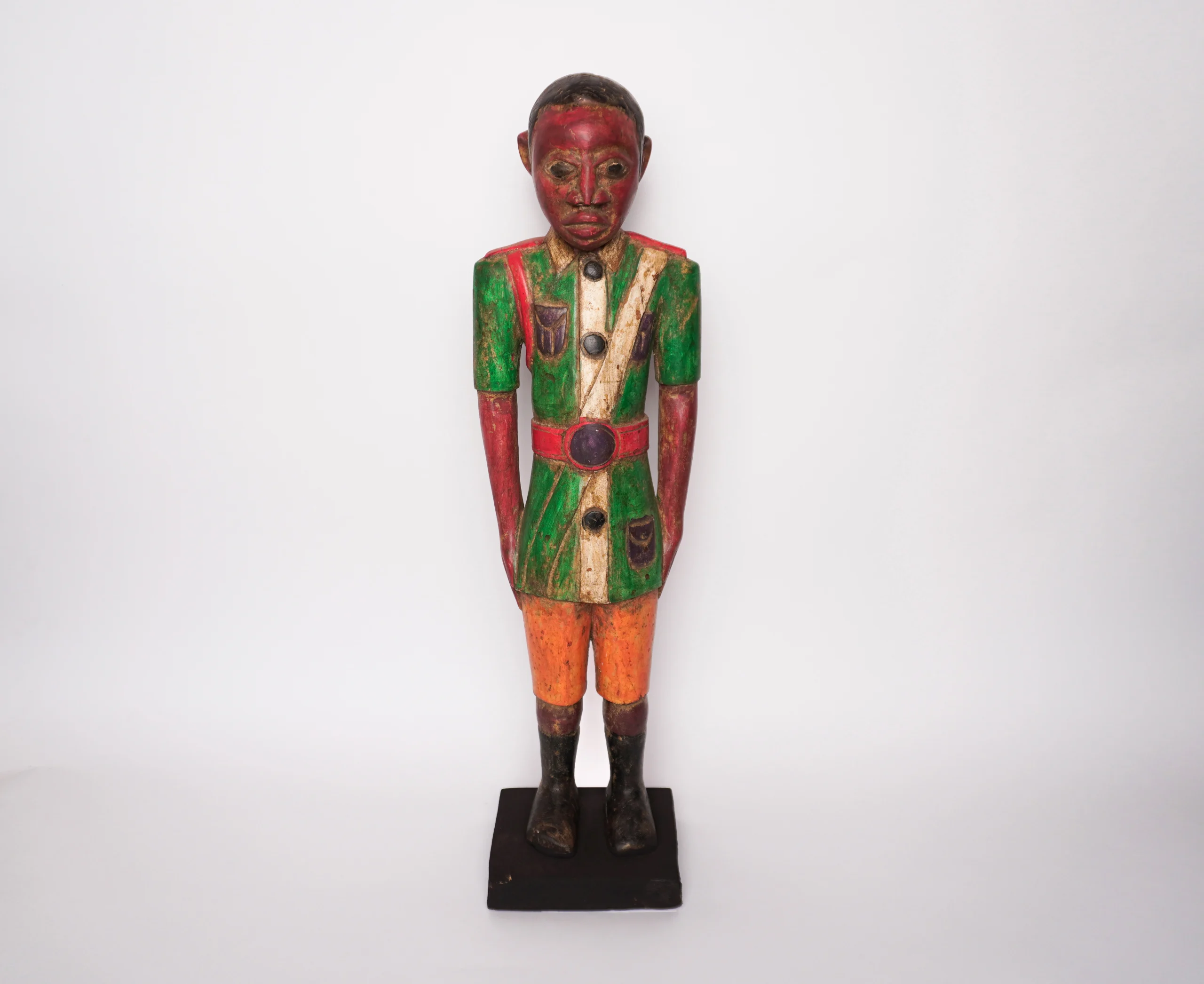 Carved Wooden Colon – A Cultural Fusion of Art and Colonial History Carved wooden colons, also known as “colon statues,” are distinctive anthropomorphic sculptures that originated in West Africa—especially in the Ivory Coast—during the colonial era. These figures are typically handcrafted from wood and brightly painted, portraying Europeans such as colonial officers, missionaries, or civil servants. They are notable for their unique blend of traditional African carving styles and European themes, making them powerful symbols of cultural intersection. Defining Characteristics: Depiction of Europeans: Colon statues often feature European subjects dressed in formal colonial attire, such as military uniforms, suits, hats, or clerical garments. These figures are portrayed with exaggerated or stylized features, highlighting the contrast between cultures. Stylistic Fusion: The artistry combines African sculptural techniques—like bold shapes, simplified forms, and symbolic proportions—with European details in clothing and posture, creating a visually striking hybrid style. Materials and Finish: Typically carved from hardwood and finished with vibrant, glossy paint, the figures are made to be both eye-catching and durable. Their colorful appearance adds a whimsical or satirical tone to the serious historical themes they represent. Cultural and Historical Significance: Commentary on Colonialism: These statues are seen by many scholars and collectors as a form of visual commentary or satire. They reflect how African artists perceived and interpreted colonial figures, sometimes idealizing, sometimes mocking, or simply documenting them. Symbol of Cultural Hybridity: Colon statues embody the blending of African traditions and foreign influences. They illustrate how African societies adapted to and represented the presence of European powers. Context of Use: While some colon figures were created as functional art for local rituals or as household items, many were produced for trade and tourism. Their popularity grew as collectible souvenirs that offered a uniquely African perspective on colonial presence. Legacy and Art Market: Today, carved wooden colons are appreciated not only for their historical significance but also for their artistic and cultural value. They are featured in art galleries, museums, and private collections around the world, celebrated as enduring artifacts of colonial-era West Africa and as bold expressions of resistance, adaptation, and artistic innovation.