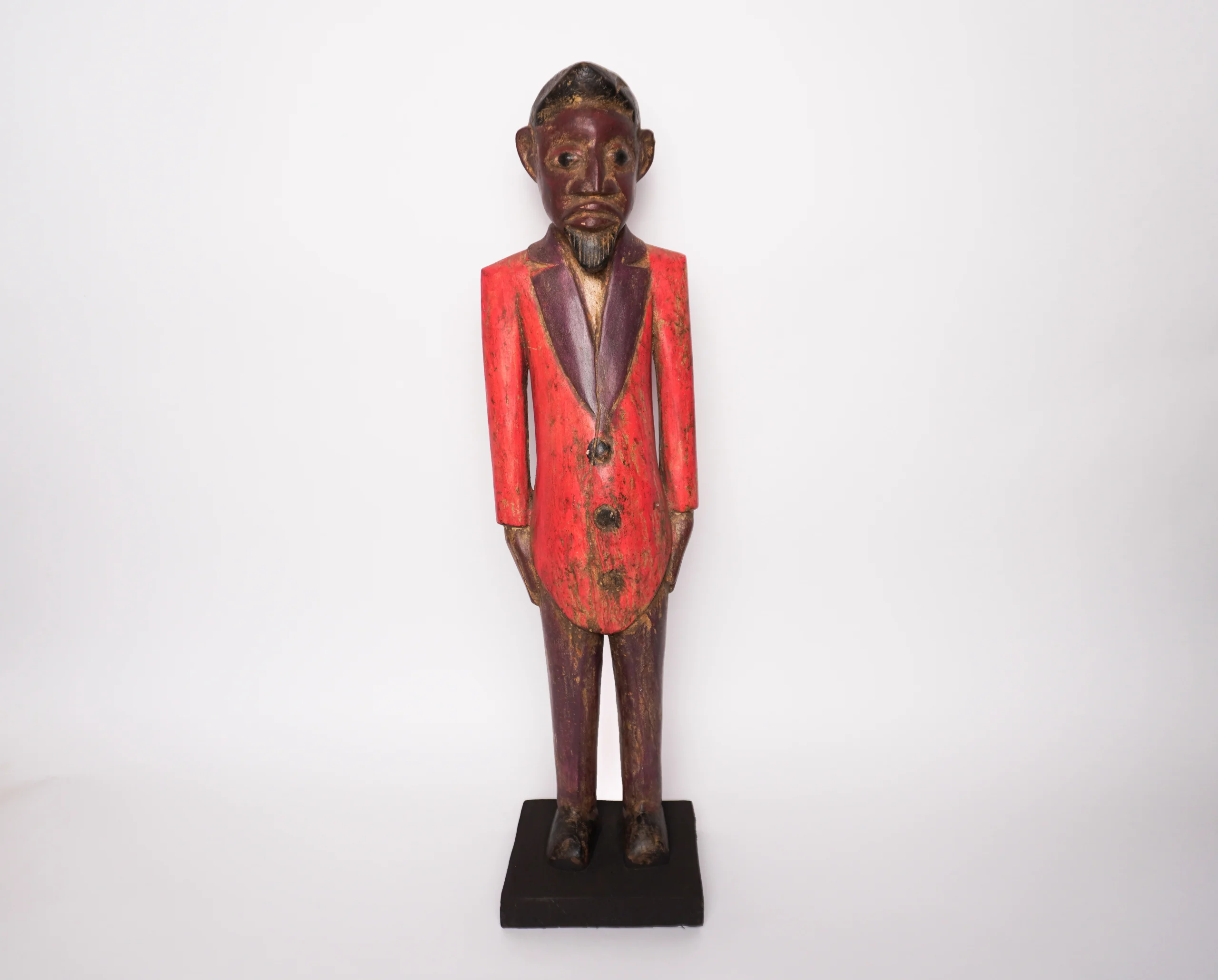 Carved Wooden Colon – A Cultural Fusion of Art and Colonial History Carved wooden colons, also known as “colon statues,” are distinctive anthropomorphic sculptures that originated in West Africa—especially in the Ivory Coast—during the colonial era. These figures are typically handcrafted from wood and brightly painted, portraying Europeans such as colonial officers, missionaries, or civil servants. They are notable for their unique blend of traditional African carving styles and European themes, making them powerful symbols of cultural intersection. Defining Characteristics: Depiction of Europeans: Colon statues often feature European subjects dressed in formal colonial attire, such as military uniforms, suits, hats, or clerical garments. These figures are portrayed with exaggerated or stylized features, highlighting the contrast between cultures. Stylistic Fusion: The artistry combines African sculptural techniques—like bold shapes, simplified forms, and symbolic proportions—with European details in clothing and posture, creating a visually striking hybrid style. Materials and Finish: Typically carved from hardwood and finished with vibrant, glossy paint, the figures are made to be both eye-catching and durable. Their colorful appearance adds a whimsical or satirical tone to the serious historical themes they represent. Cultural and Historical Significance: Commentary on Colonialism: These statues are seen by many scholars and collectors as a form of visual commentary or satire. They reflect how African artists perceived and interpreted colonial figures, sometimes idealizing, sometimes mocking, or simply documenting them. Symbol of Cultural Hybridity: Colon statues embody the blending of African traditions and foreign influences. They illustrate how African societies adapted to and represented the presence of European powers. Context of Use: While some colon figures were created as functional art for local rituals or as household items, many were produced for trade and tourism. Their popularity grew as collectible souvenirs that offered a uniquely African perspective on colonial presence. Legacy and Art Market: Today, carved wooden colons are appreciated not only for their historical significance but also for their artistic and cultural value. They are featured in art galleries, museums, and private collections around the world, celebrated as enduring artifacts of colonial-era West Africa and as bold expressions of resistance, adaptation, and artistic innovation.