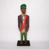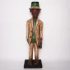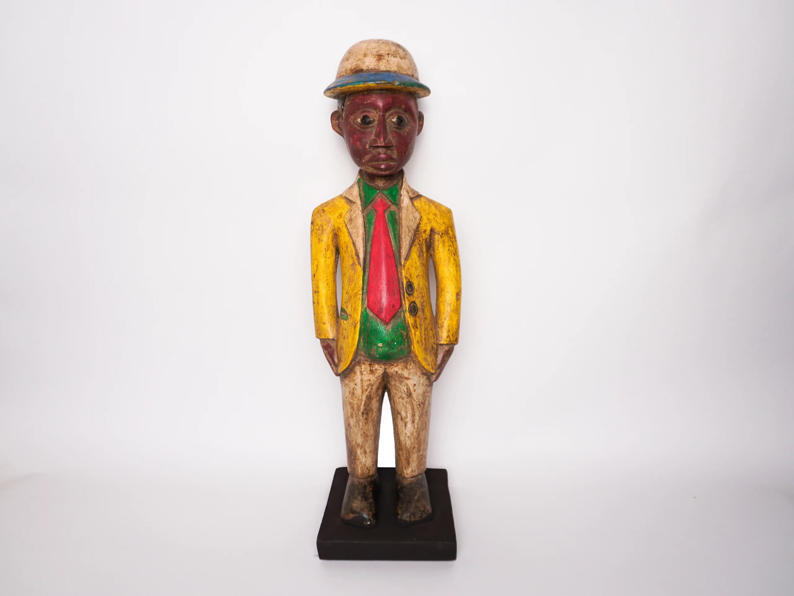 Carved Wooden Colon – A Cultural Fusion of Art and Colonial History Carved wooden colons, also known as “colon statues,” are distinctive anthropomorphic sculptures that originated in West Africa—especially in the Ivory Coast—during the colonial era. These figures are typically handcrafted from wood and brightly painted, portraying Europeans such as colonial officers, missionaries, or civil servants. They are notable for their unique blend of traditional African carving styles and European themes, making them powerful symbols of cultural intersection. Defining Characteristics: Depiction of Europeans: Colon statues often feature European subjects dressed in formal colonial attire, such as military uniforms, suits, hats, or clerical garments. These figures are portrayed with exaggerated or stylized features, highlighting the contrast between cultures. Stylistic Fusion: The artistry combines African sculptural techniques—like bold shapes, simplified forms, and symbolic proportions—with European details in clothing and posture, creating a visually striking hybrid style. Materials and Finish: Typically carved from hardwood and finished with vibrant, glossy paint, the figures are made to be both eye-catching and durable. Their colorful appearance adds a whimsical or satirical tone to the serious historical themes they represent. Cultural and Historical Significance: Commentary on Colonialism: These statues are seen by many scholars and collectors as a form of visual commentary or satire. They reflect how African artists perceived and interpreted colonial figures, sometimes idealizing, sometimes mocking, or simply documenting them. Symbol of Cultural Hybridity: Colon statues embody the blending of African traditions and foreign influences. They illustrate how African societies adapted to and represented the presence of European powers. Context of Use: While some colon figures were created as functional art for local rituals or as household items, many were produced for trade and tourism. Their popularity grew as collectible souvenirs that offered a uniquely African perspective on colonial presence. Legacy and Art Market: Today, carved wooden colons are appreciated not only for their historical significance but also for their artistic and cultural value. They are featured in art galleries, museums, and private collections around the world, celebrated as enduring artifacts of colonial-era West Africa and as bold expressions of resistance, adaptation, and artistic innovation.