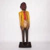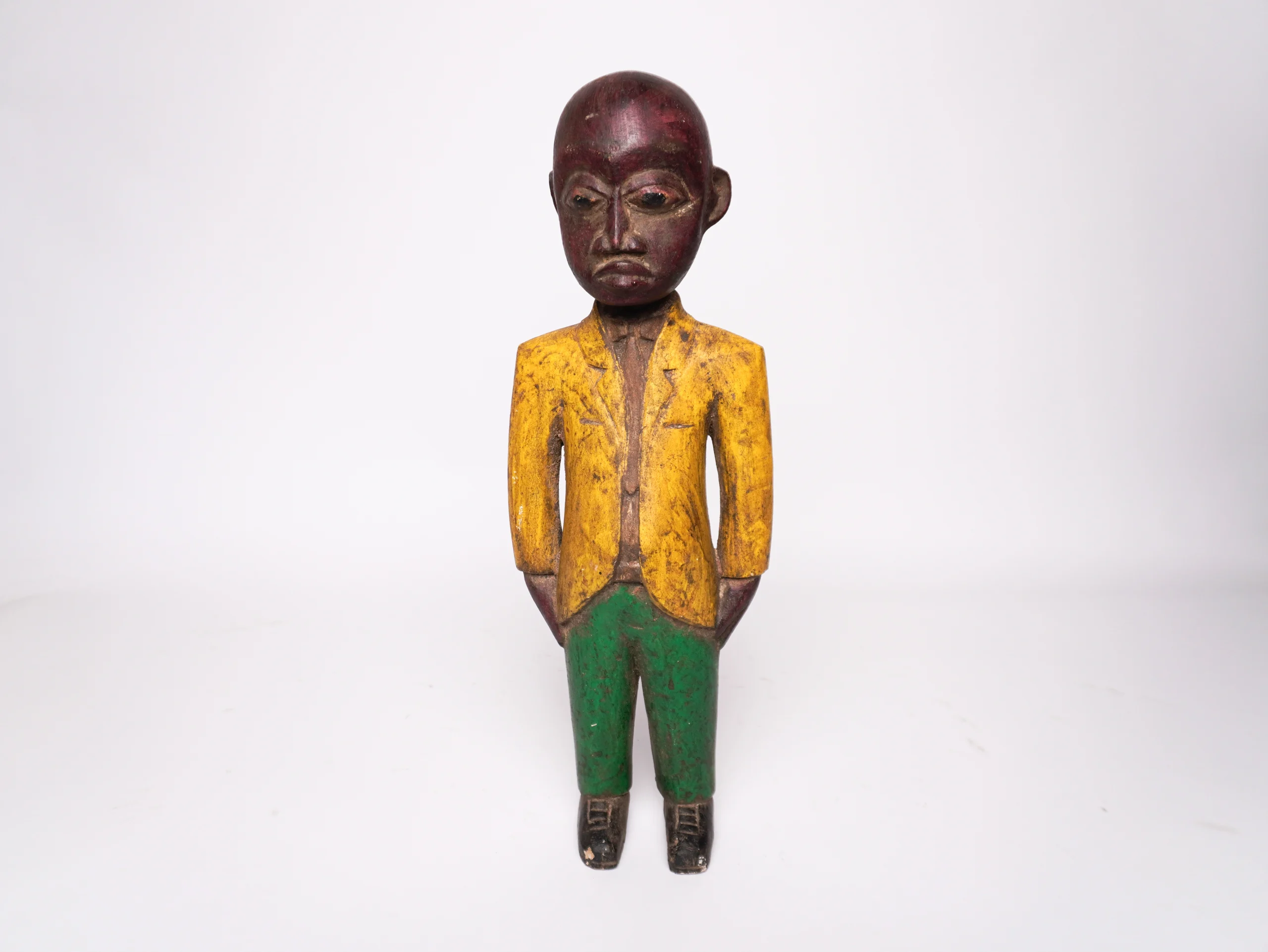 Carved Wooden Colon – A Cultural Fusion of Art and Colonial History Carved wooden colons, also known as “colon statues,” are distinctive anthropomorphic sculptures that originated in West Africa—especially in the Ivory Coast—during the colonial era. These figures are typically handcrafted from wood and brightly painted, portraying Europeans such as colonial officers, missionaries, or civil servants. They are notable for their unique blend of traditional African carving styles and European themes, making them powerful symbols of cultural intersection. Defining Characteristics: Depiction of Europeans: Colon statues often feature European subjects dressed in formal colonial attire, such as military uniforms, suits, hats, or clerical garments. These figures are portrayed with exaggerated or stylized features, highlighting the contrast between cultures. Stylistic Fusion: The artistry combines African sculptural techniques—like bold shapes, simplified forms, and symbolic proportions—with European details in clothing and posture, creating a visually striking hybrid style. Materials and Finish: Typically carved from hardwood and finished with vibrant, glossy paint, the figures are made to be both eye-catching and durable. Their colorful appearance adds a whimsical or satirical tone to the serious historical themes they represent. Cultural and Historical Significance: Commentary on Colonialism: These statues are seen by many scholars and collectors as a form of visual commentary or satire. They reflect how African artists perceived and interpreted colonial figures, sometimes idealizing, sometimes mocking, or simply documenting them. Symbol of Cultural Hybridity: Colon statues embody the blending of African traditions and foreign influences. They illustrate how African societies adapted to and represented the presence of European powers. Context of Use: While some colon figures were created as functional art for local rituals or as household items, many were produced for trade and tourism. Their popularity grew as collectible souvenirs that offered a uniquely African perspective on colonial presence. Legacy and Art Market: Today, carved wooden colons are appreciated not only for their historical significance but also for their artistic and cultural value. They are featured in art galleries, museums, and private collections around the world, celebrated as enduring artifacts of colonial-era West Africa and as bold expressions of resistance, adaptation, and artistic innovation.