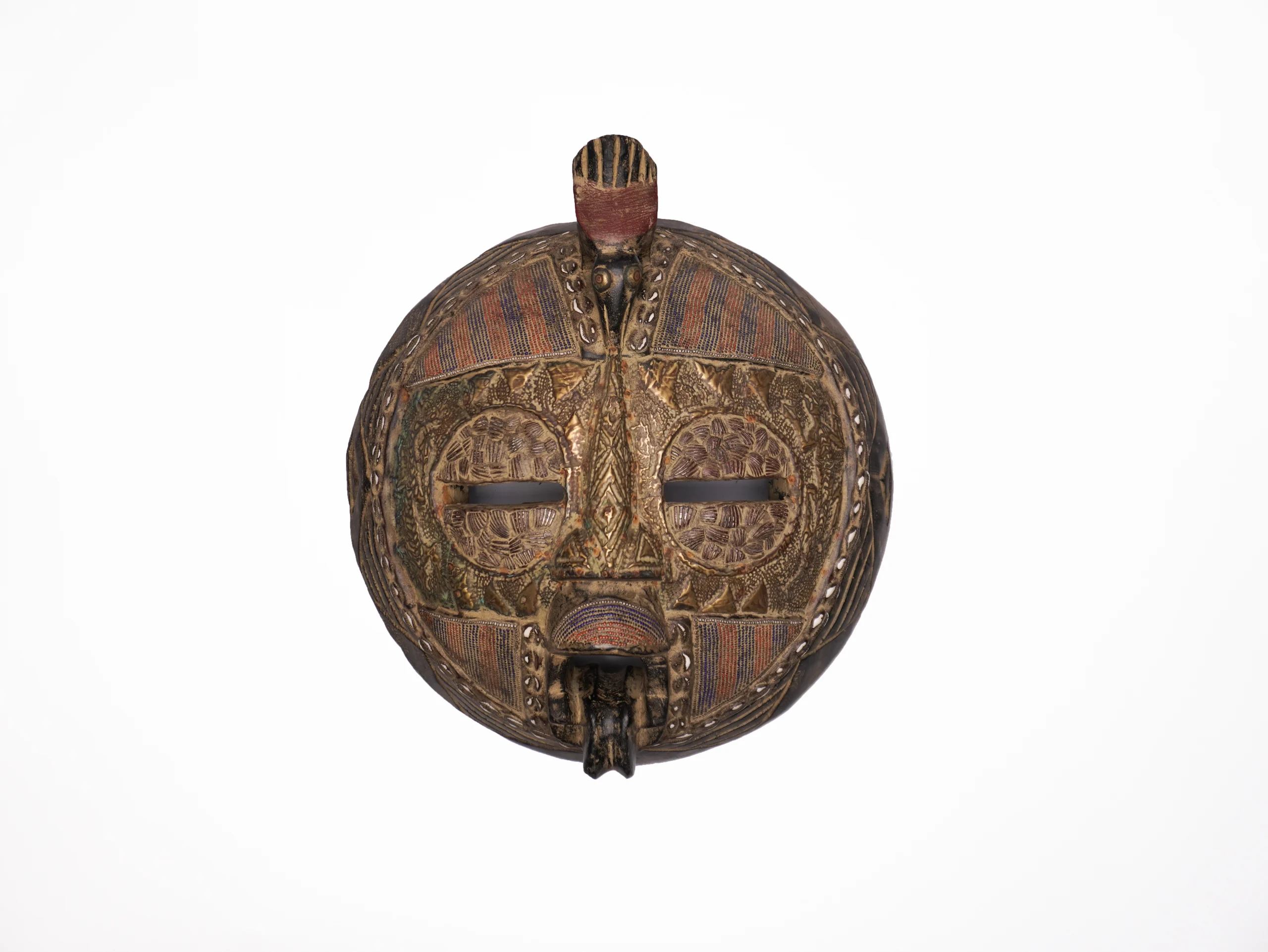 Ghanaian Round masks are typically made of wood and often feature a combination of geometric patterns, bold shapes, and symbolic elements. They are known for their association with well-being, harmony, and ancestral connections, often used in ceremonies and celebrations. The masks can vary in size and may incorporate intricate beadwork or other decorative elements like brass triangles. Here’s a more detailed look: Shape and Design: • Circular or round: The most defining characteristic is their rounded shape, which can vary in size and depth. • Geometric patterns: Many masks feature etched or carved geometric designs, sometimes arranged in a grid-like pattern. • Symbolic features: They often incorporate elements like slit eyes, protruding tongues, or abstracted facial features, each carrying specific symbolic meaning. Materials and Decoration: • Wood: The masks are primarily crafted from wood. • Beadwork: Some masks, particularly those from the Ashanti region, feature intricate beadwork in various colors. • Brass and other embellishments: Brass triangles, or other decorative elements, may also be incorporated. Cultural Significance: • Ceremonial use: Round masks are frequently used in ceremonies, festivals, and masquerade performances. • Spiritual connection: They are believed to facilitate communication with ancestors or spirits, bridging the gap between the physical and spiritual realms. • Symbolism of well-being: The masks often represent positive concepts like well-being, harmony, and prosperity. • Ashanti and Baule influence: Some masks, like those from the Ashanti region, showcase Baule sculpture styles and symbolism related to beauty and refinement
