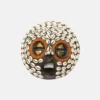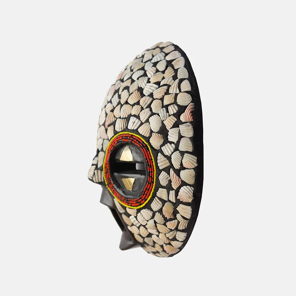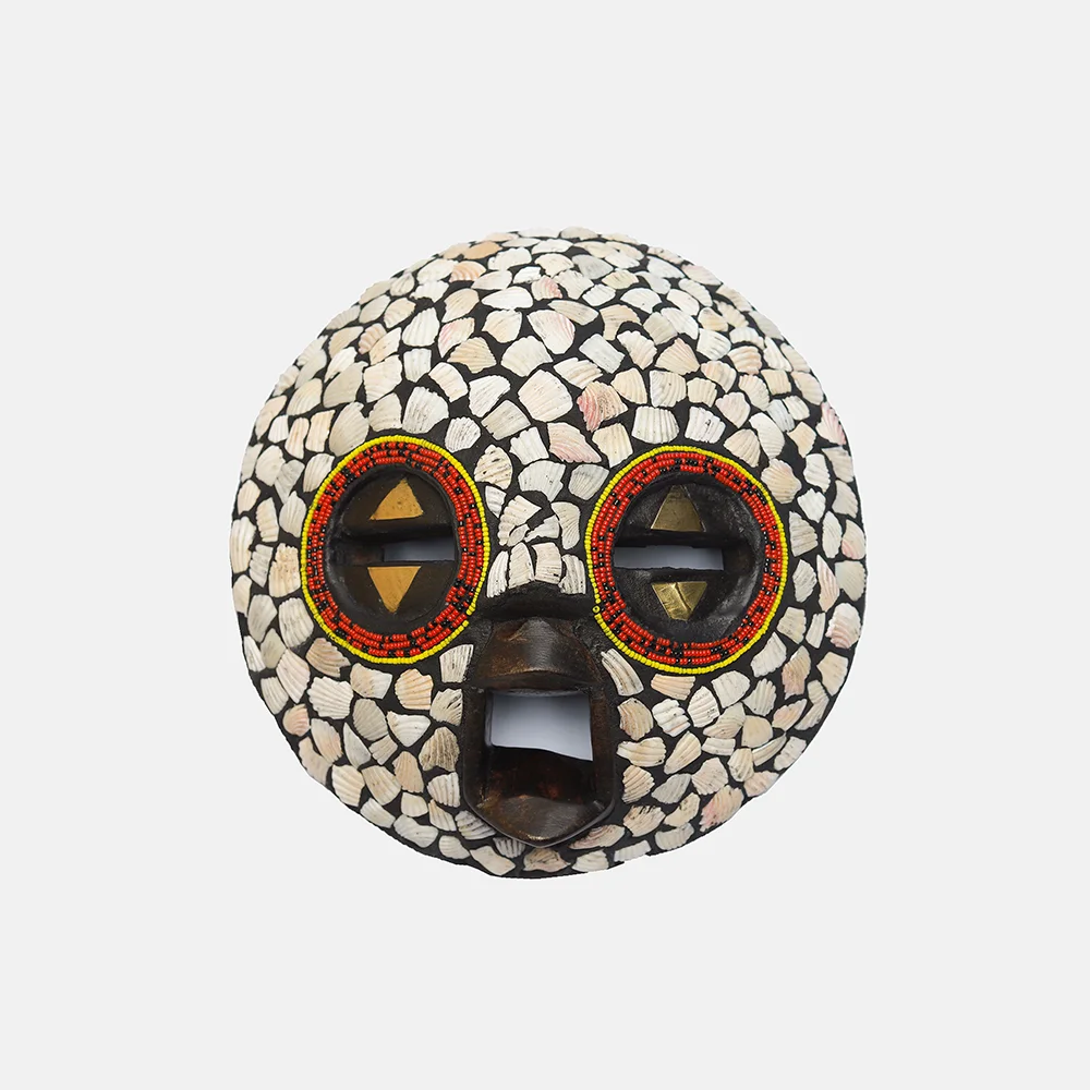 Ghanaian Round masks are typically made of wood and often feature a combination of geometric patterns, bold shapes, and symbolic elements. They are known for their association with well-being, harmony, and ancestral connections, often used in ceremonies and celebrations. The masks can vary in size and may incorporate intricate beadwork or other decorative elements like brass triangles. Here’s a more detailed look: Shape and Design: • Circular or round: The most defining characteristic is their rounded shape, which can vary in size and depth. • Geometric patterns: Many masks feature etched or carved geometric designs, sometimes arranged in a grid-like pattern. • Symbolic features: They often incorporate elements like slit eyes, protruding tongues, or abstracted facial features, each carrying specific symbolic meaning. Materials and Decoration: • Wood: The masks are primarily crafted from wood. • Beadwork: Some masks, particularly those from the Ashanti region, feature intricate beadwork in various colors. • Brass and other embellishments: Brass triangles, or other decorative elements, may also be incorporated. Cultural Significance: • Ceremonial use: Round masks are frequently used in ceremonies, festivals, and masquerade performances. • Spiritual connection: They are believed to facilitate communication with ancestors or spirits, bridging the gap between the physical and spiritual realms. • Symbolism of well-being: The masks often represent positive concepts like well-being, harmony, and prosperity. • Ashanti and Baule influence: Some masks, like those from the Ashanti region, showcase Baule sculpture styles and symbolism related to beauty and refinement