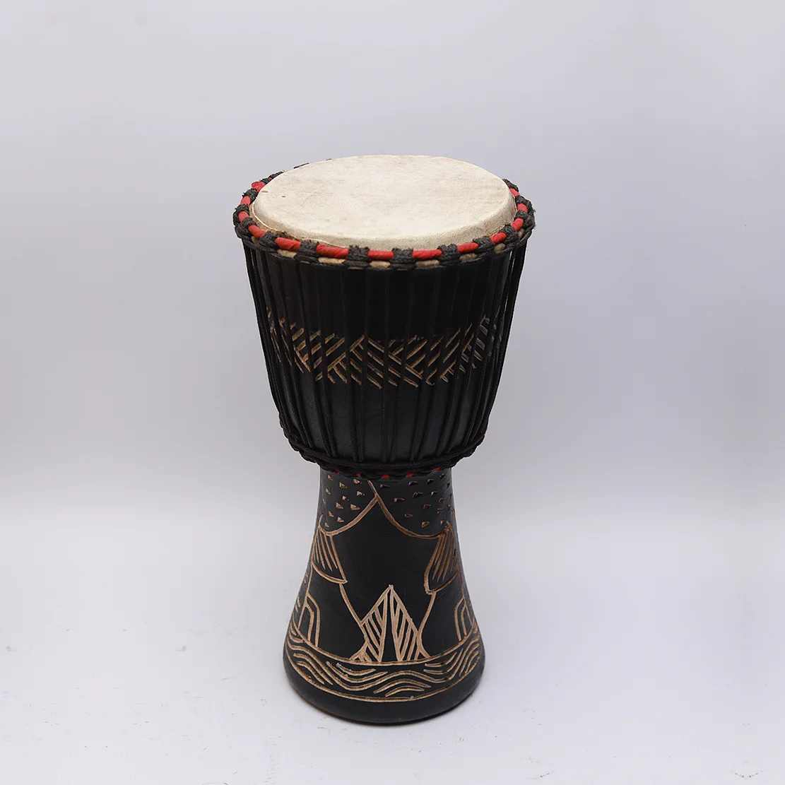 A djembe is a traditional West African goblet-shaped drum, skillfully hand-carved from a single piece of hardwood and topped with a tightly stretched animal skin, usually goat. Known for its broad range of tones—deep bass, mid-range tones, and sharp slaps—it is played with bare hands and used in a wide variety of cultural, ceremonial, and musical settings. Key Characteristics: Shape & Construction: The djembe has a goblet-like shape with a wide top and narrow base, carved from durable woods like Mansonia. Drum Head: The head is typically made of goatskin, stretched and held in place using a rope tuning system that also allows for tonal adjustments. Playing Technique: Played with bare hands, the djembe can produce diverse sounds based on striking technique and hand placement. Decorative Carvings: Many djembes feature intricate hand-carved designs on the wooden body, reflecting the artisan’s region or cultural influences. Versatility: Used for traditional ceremonies, modern performances, dance accompaniment, and storytelling. Crafting Process: Wood Selection: A solid, resonant hardwood is selected. Shaping: The wood is carved into a goblet shape using hand tools or machines. Detailing: Artistic carvings are added to enhance aesthetic and cultural value. Skin Preparation: Goat skin is cleaned, dried, and stretched over the drum top. Rope Work: Rope is laced in a specific pattern to hold and tune the drumhead. Finishing: The drum is sealed with oil or varnish to protect it. Cultural Significance: Originating in countries like Mali, the djembe is more than just an instrument—it’s a symbol of community, unity, and communication. The name “djembe” is believed to come from the Bamana saying “Anke djé, anke bé,” meaning “everyone gather together in peace,” highlighting the drum’s role in social cohesion.
