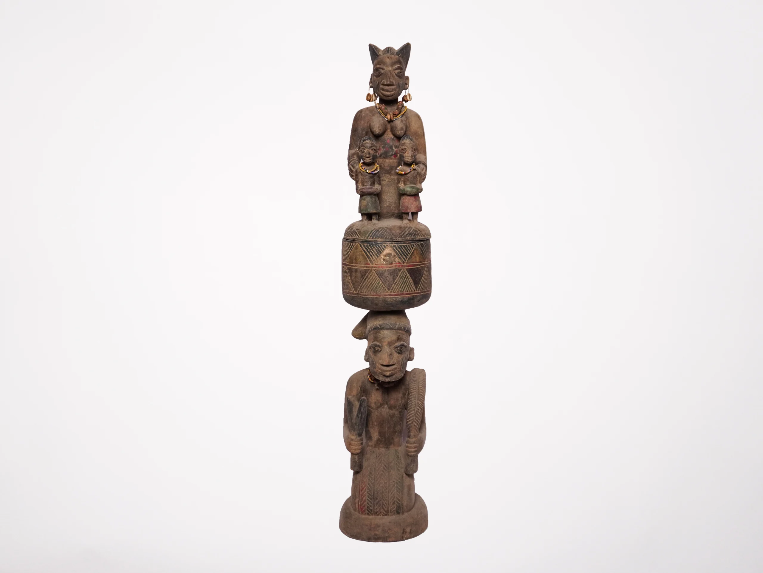 A Yoruba carved wooden pot statue, commonly known as an Agere Ifa, is a traditional vessel crafted by the Yoruba people of Nigeria and used in sacred rituals—particularly in Ifa divination. These statues are typically made from wood and serve as containers for items such as sacred palm nuts, kola nuts, or other offerings used in ceremonies dedicated to deities known as Orisha. Key Features and Purpose: Functionality: The carved pot serves as a ritual container, often placed on an altar during divination or offerings. Imagery and Symbolism: They frequently depict kneeling women—symbolizing humility and devotion—sometimes holding children or animals like roosters. These figures often carry the pot on their heads, reinforcing themes of service and motherhood. Spiritual Role: The statue serves as a physical and symbolic bridge between the human and spirit worlds. It honors the Orisha and is used to store items essential for invoking their presence and blessings. Craftsmanship and Design: Material: Usually carved from wood, sometimes incorporating other natural elements. The craftsmanship may include highly detailed patterns, motifs, and symbolic figures. Design Variations: While some Agere Ifa feature a single figure, others may present equestrian riders or birds—each with its own spiritual meaning. Lids may be carved as part of the statue, sometimes removable for storing offerings. Color and Finish: Though many are left unpainted to showcase the wood’s texture, some are accented with colors like white and blue, symbolizing purity and divine energy. Cultural Significance: These carved pots are not just art objects but are considered sacred tools in Yoruba religion. They are used in Ifa divination—a practice central to Yoruba spiritual life—and represent honor, service, fertility, and spiritual communication. Their design and usage reflect the Yoruba worldview, where every object carries both functional and spiritual weight.